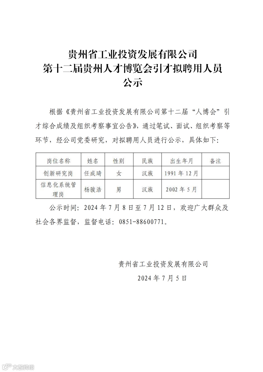 贵州省工业投资发展有限公司第十二届贵州人才博览会引才拟聘用人员公示