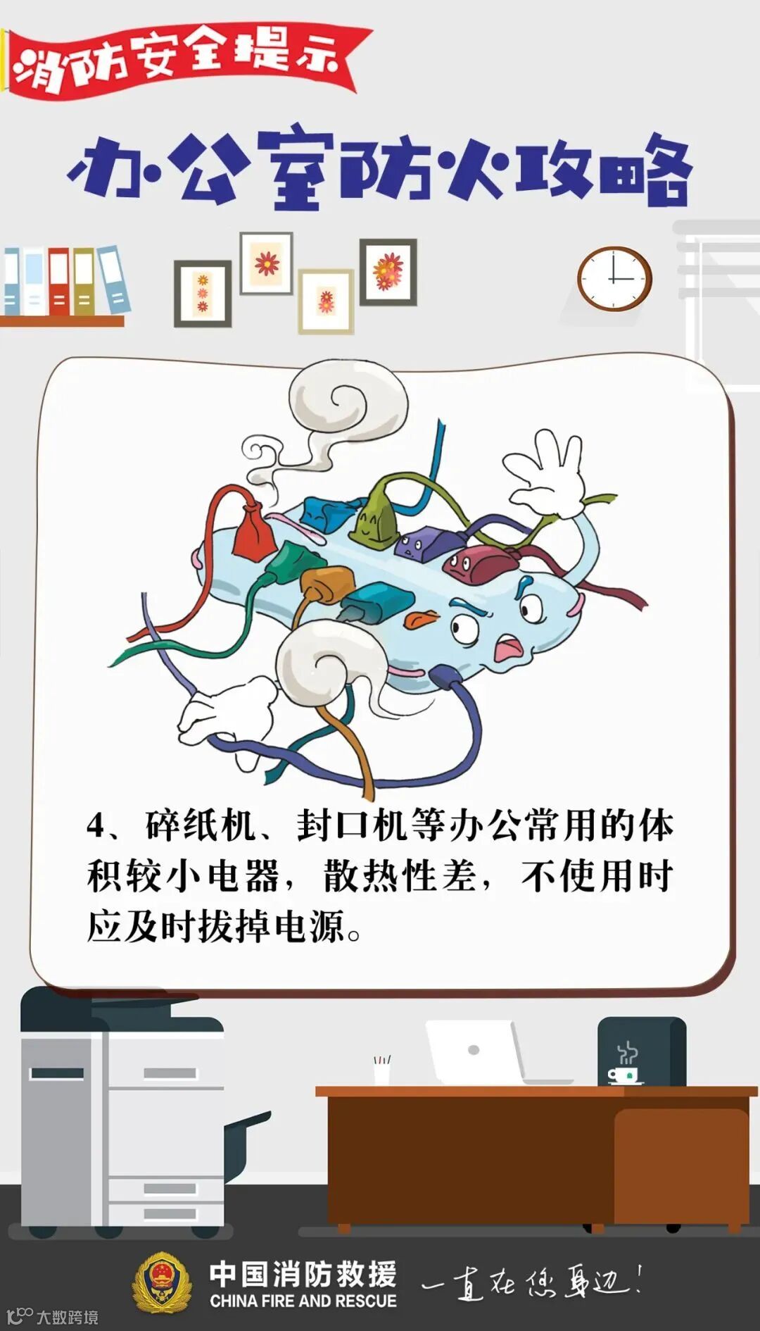 办公室存在大量电器,如空调、饮水机、电脑、打印机等,容易出现私拉乱接电线和将多个大功率电器插在一个插线板上的现象,都极易引起线路发热,继而导致起火。