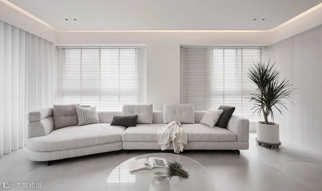 以大型曲弧沙发、自由蔓生绿植,柔和了满室样态