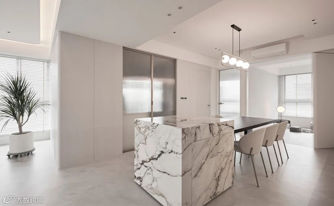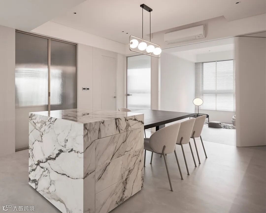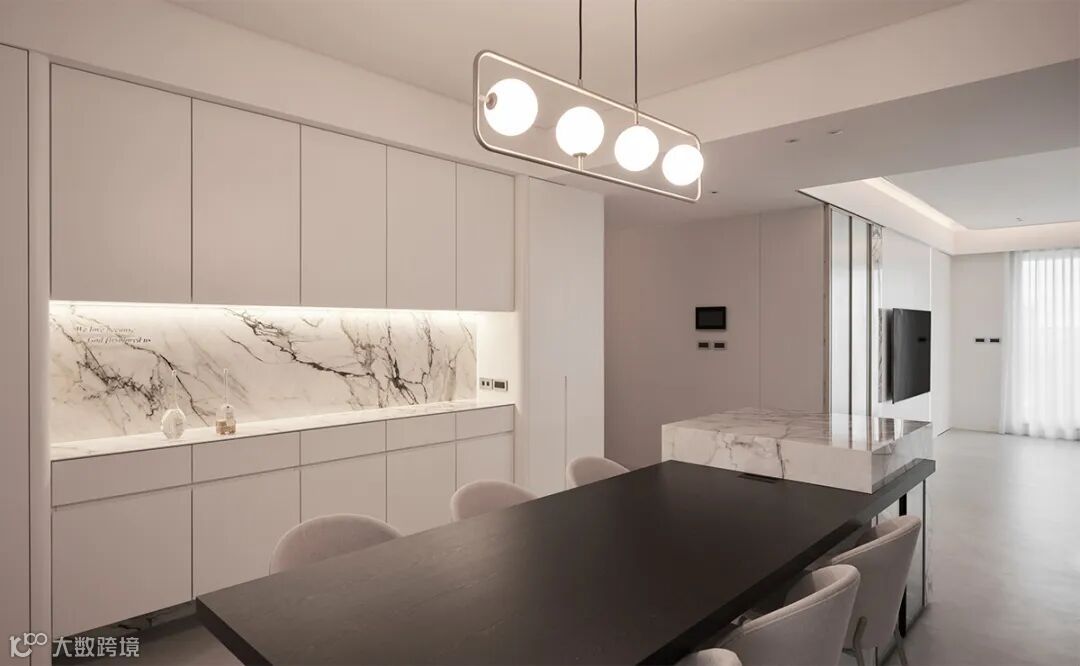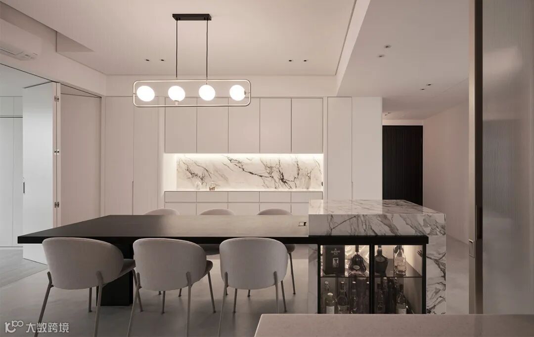 将中岛台作为核心,餐桌从台面侧边