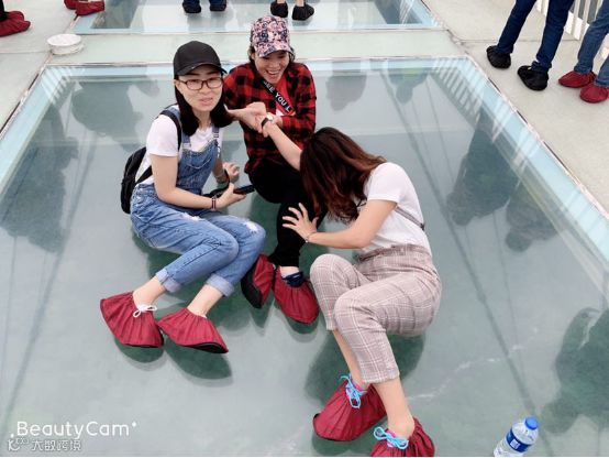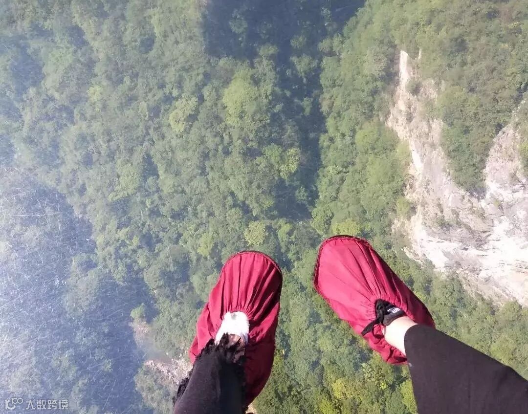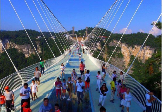 没错,这就是传说中让人闻风丧胆的玻璃桥了,看看这悬空的设计,看看这贼亮的玻璃,站在上面是脚也软心也慌,恐高症群体慎入。