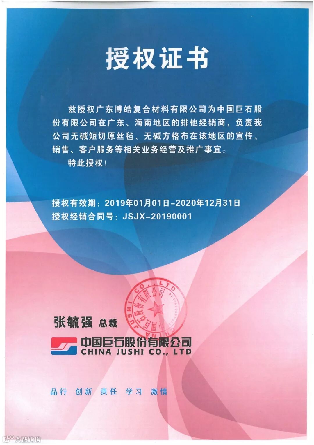 自2014年1月1日首次获得中国巨石授权以来,广东博皓已连续五年成为中国巨石广东、海南地区的排他经销商。