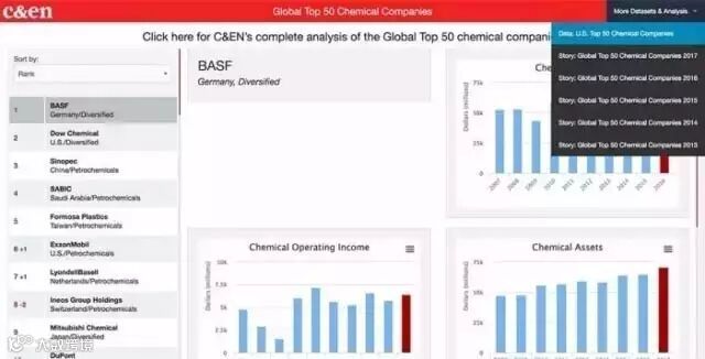 《化学与工程新闻》于2017年7月24日发布2017年全球化工前50名排行榜,比较2016年排名,显示化工行业仍然发展强劲,销售额有下降, 但利润有上升。