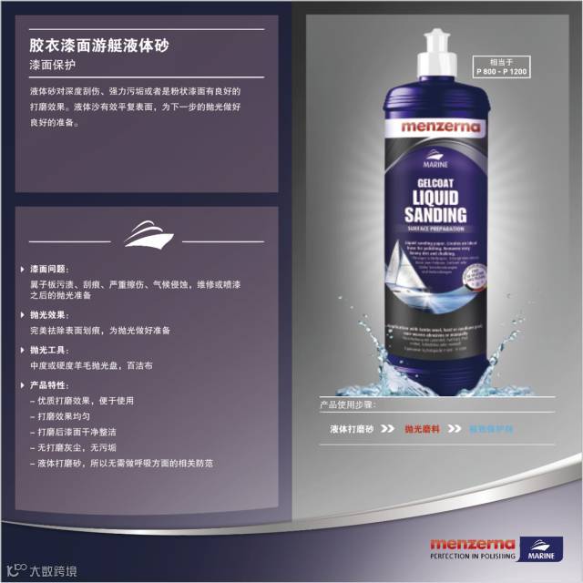 游艇液体砂(液体砂纸)则是打磨届的佼佼者,用于打磨,去除砂纸痕,比传统砂纸效率更高,可节约70%的砂纸。打磨后效果均匀,漆面干净整洁,无垢、无尘。