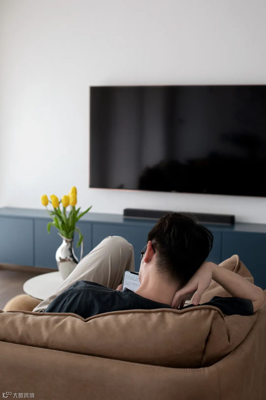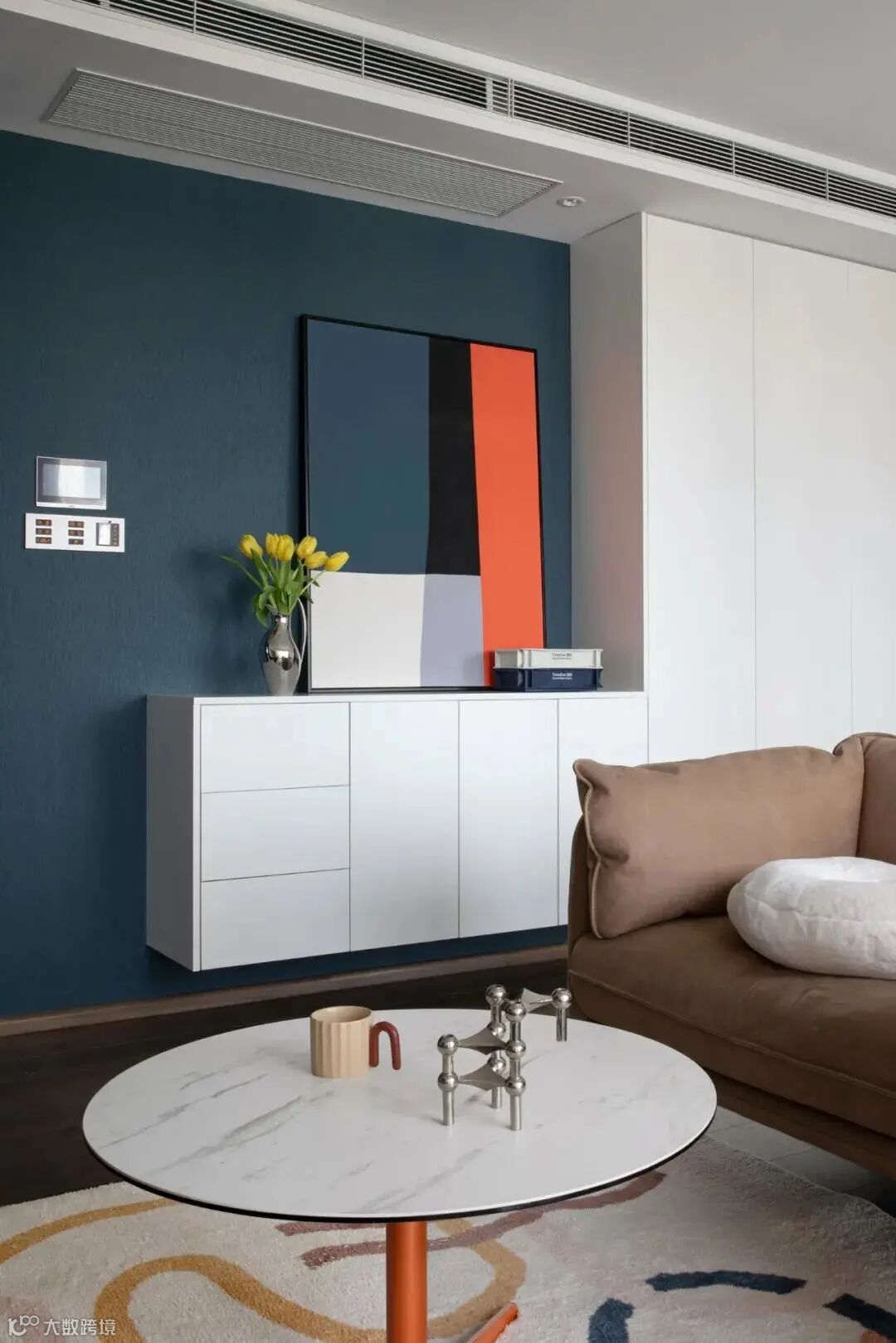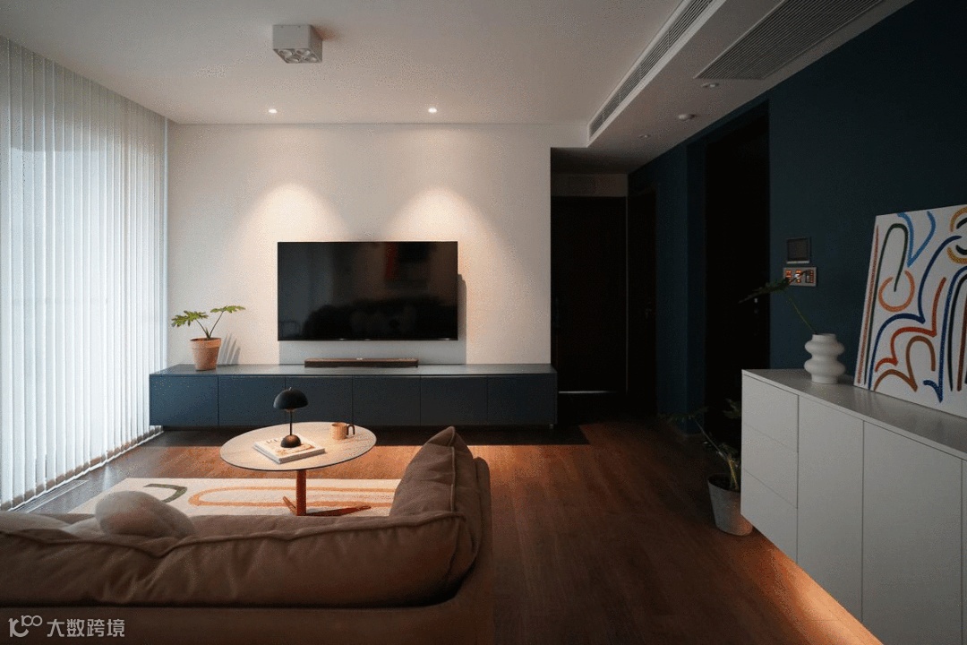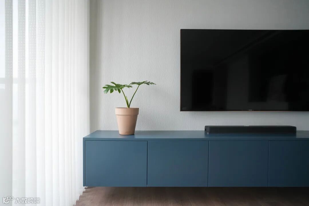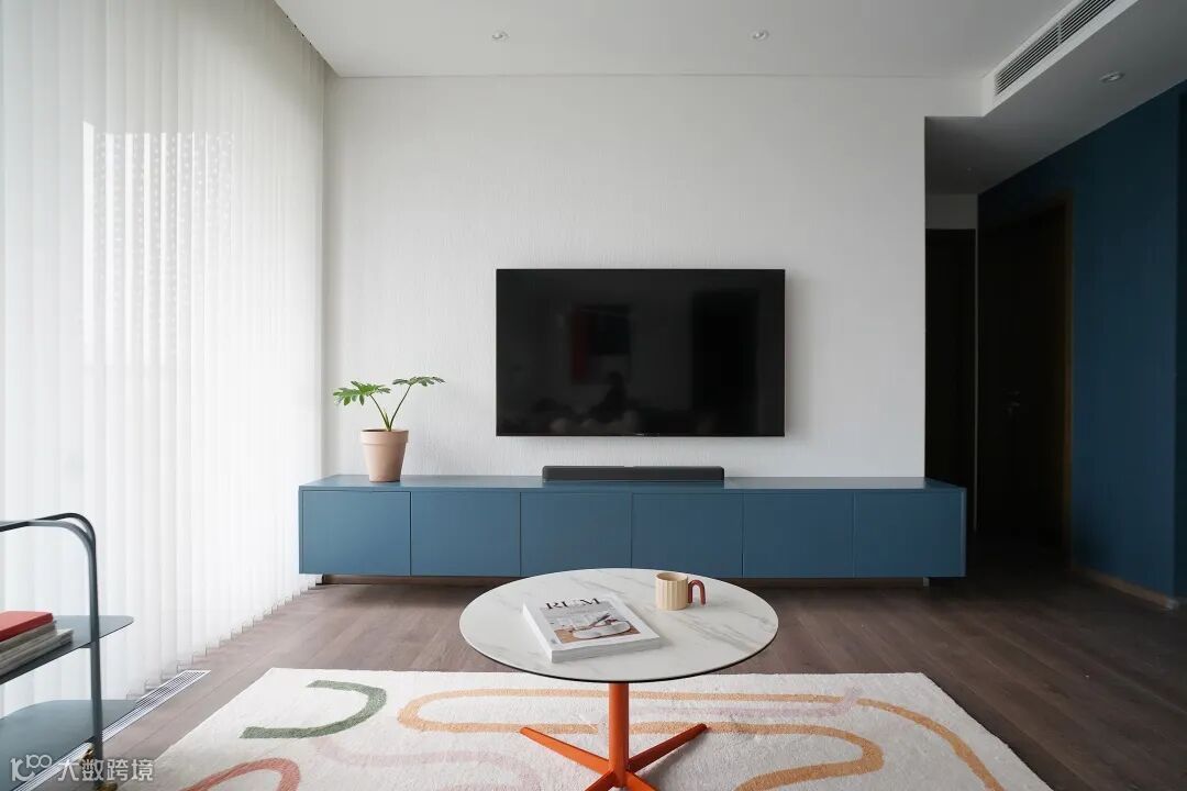 定制的电视柜悬空设计,避免卫生死角,简洁利落,柜门选用哑光烤漆材质,颜色则根据墙漆定制。