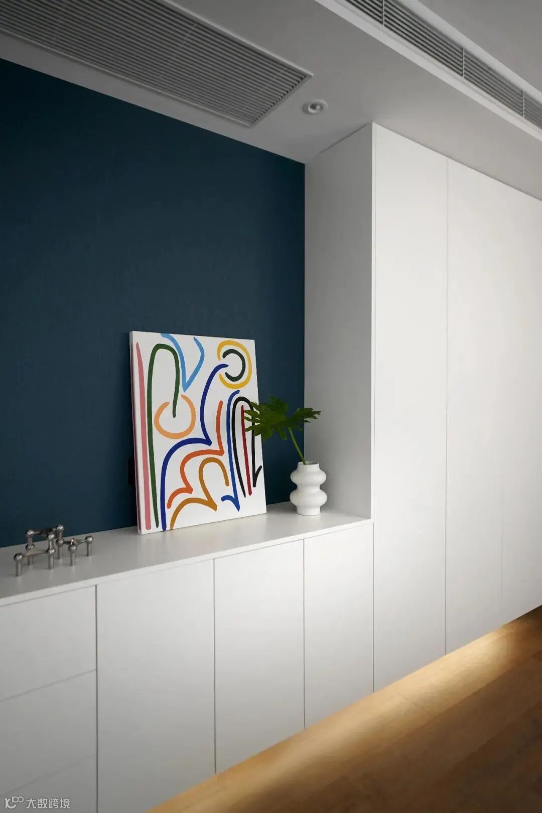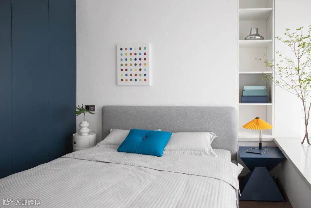 基于屋主希望主卧配色明快阳光些的需求,设计师将作为视觉焦点的背景墙留白,侧面衣柜用深蓝色定制哑光烤漆面板,质感温润。