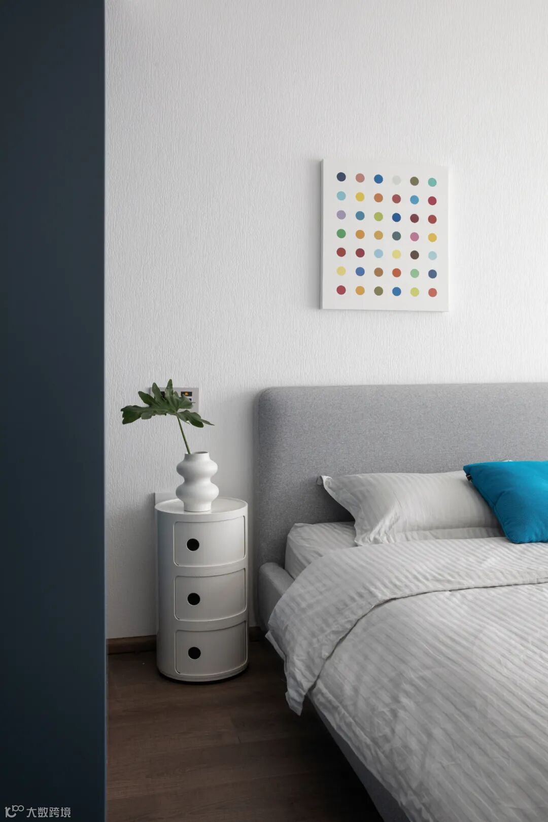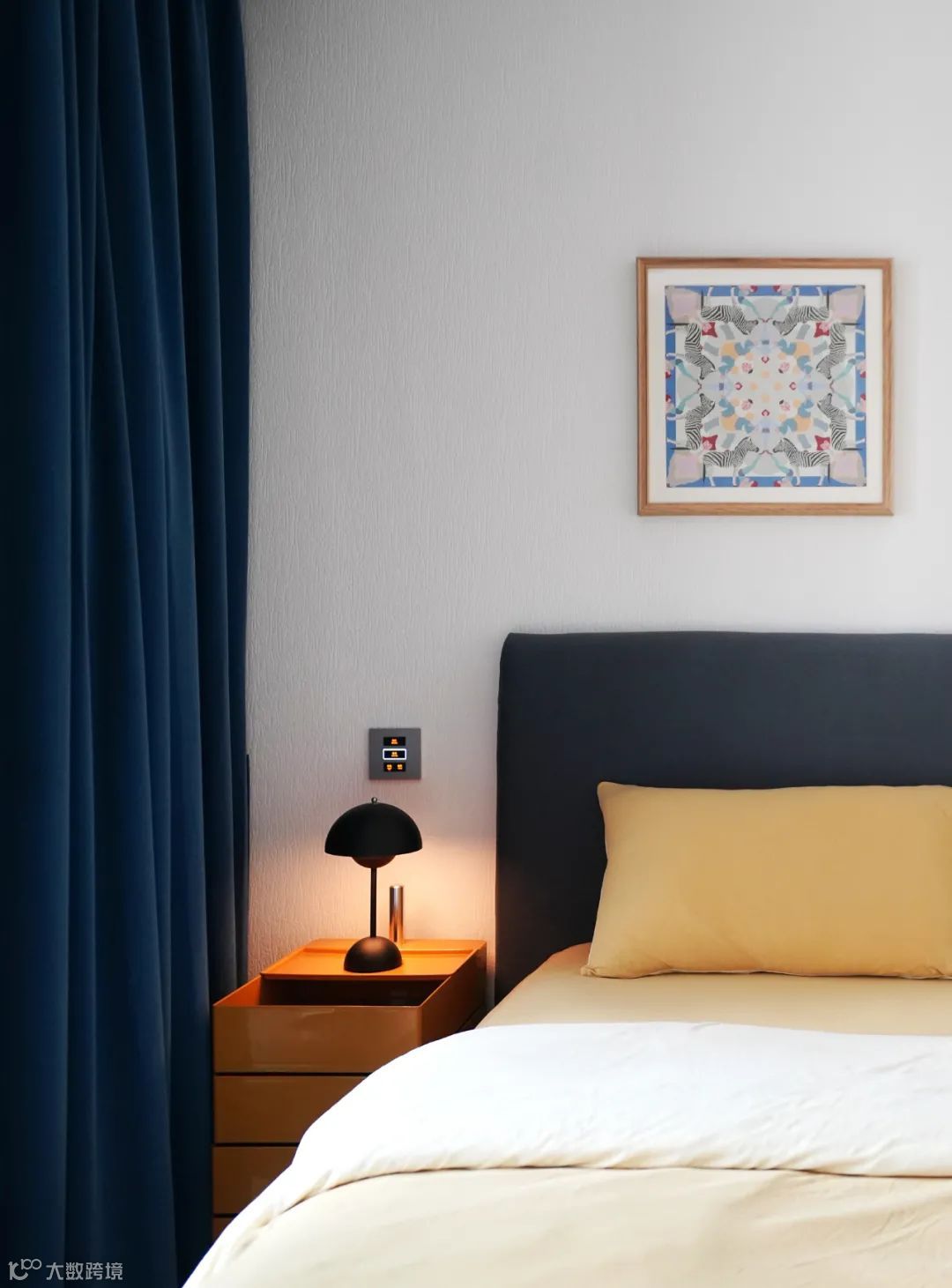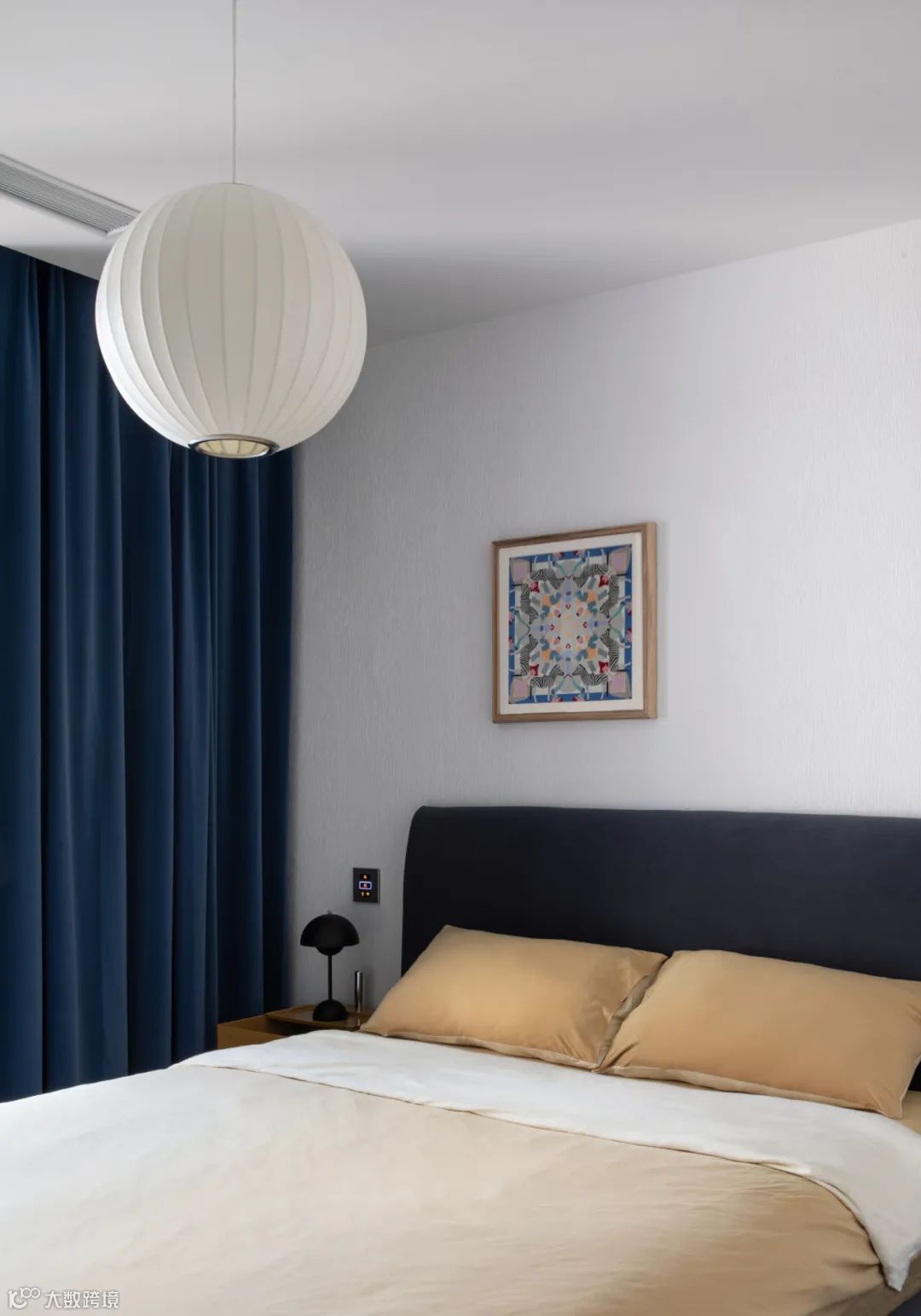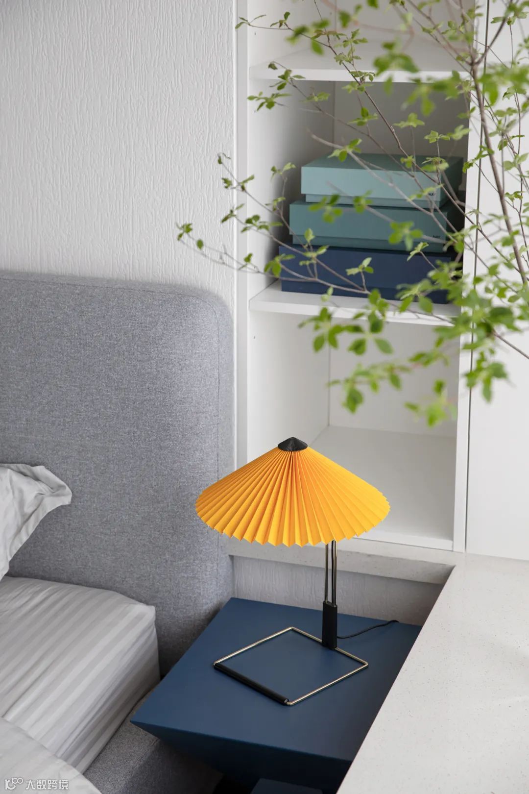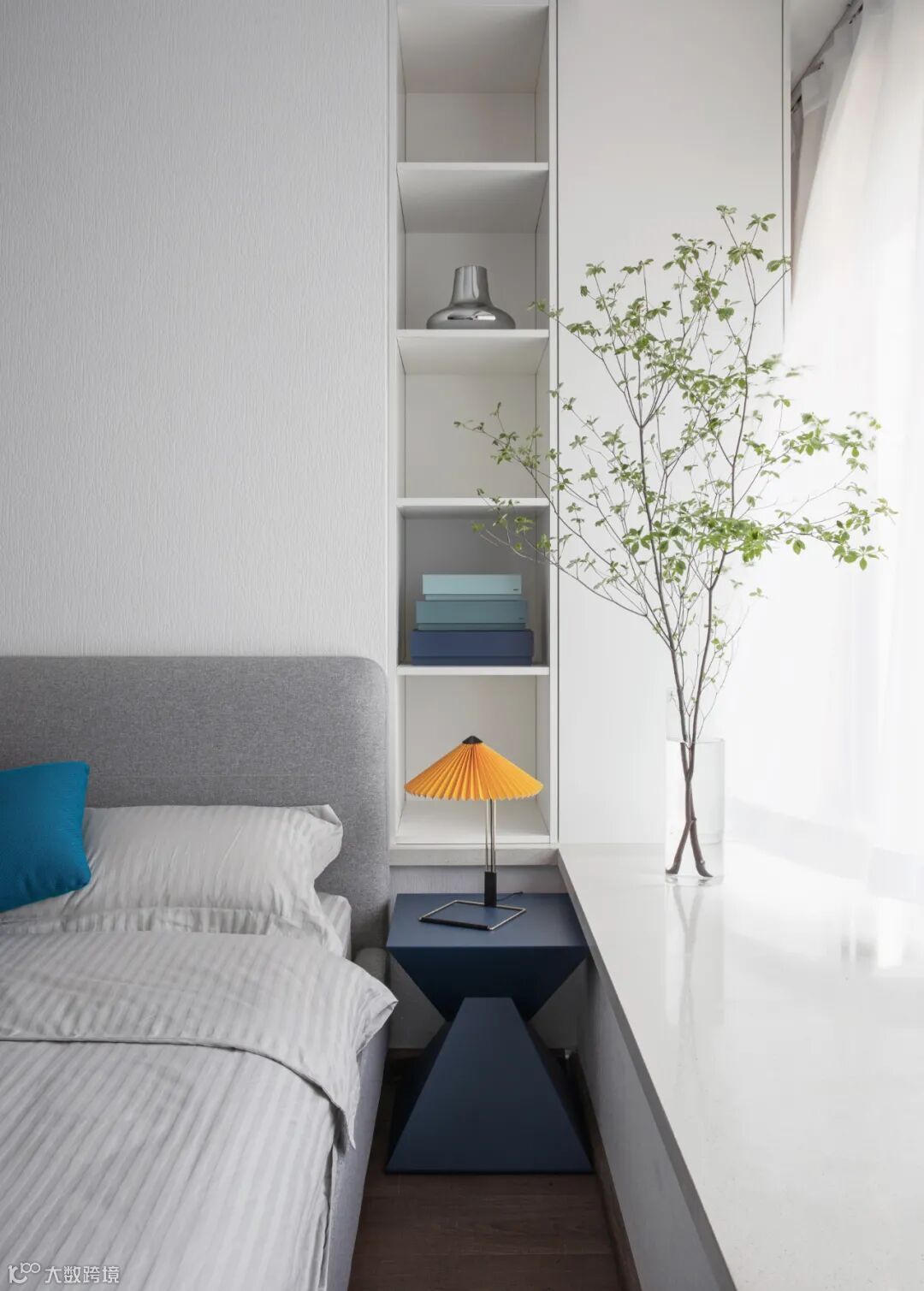 蓝白灰的卧室点缀黄色折纸台灯十分提气,镂空底座造型不占用床头柜空间,实用好看。