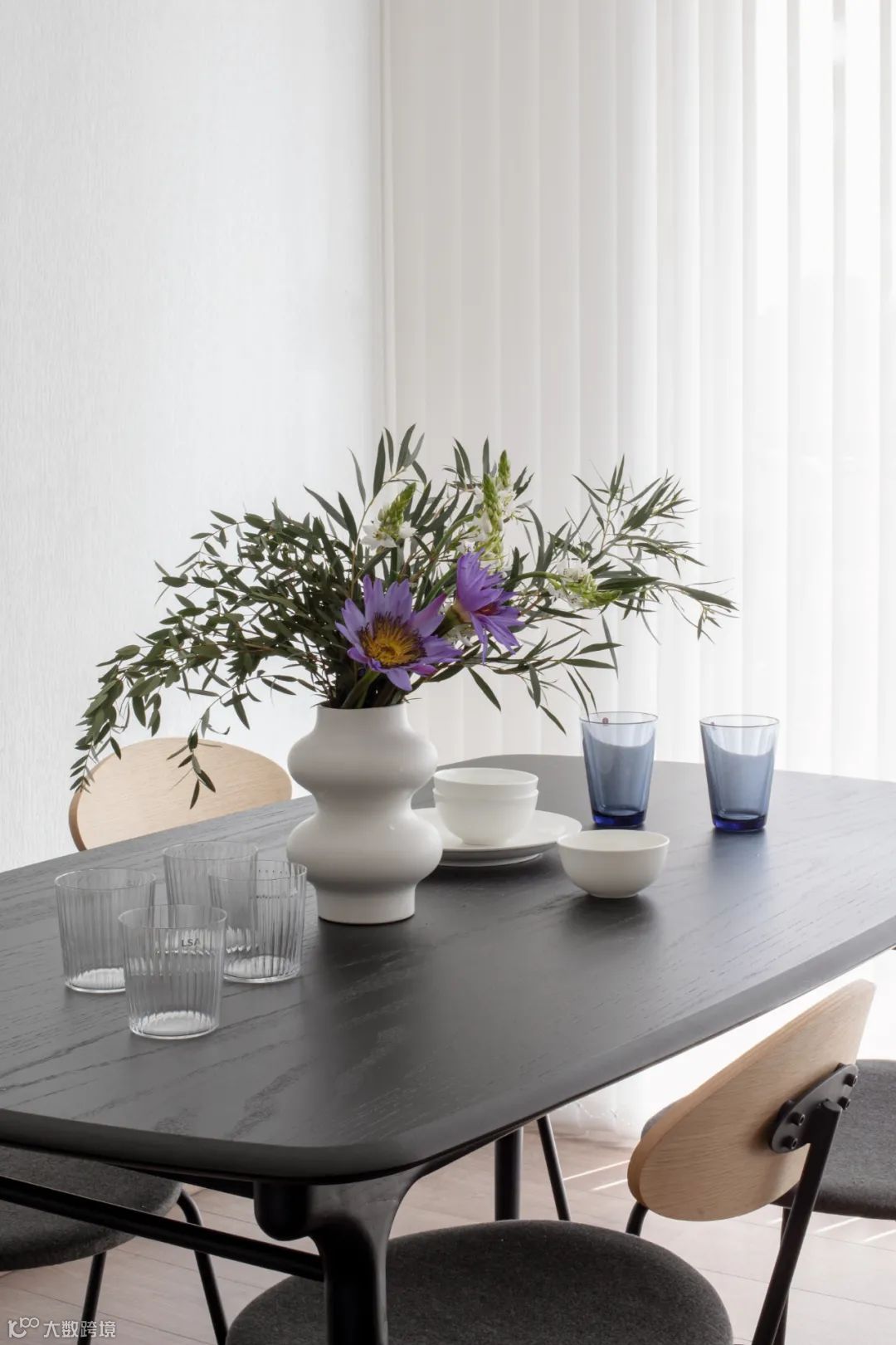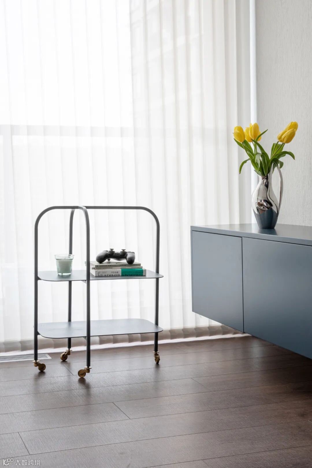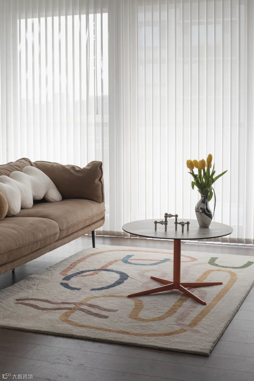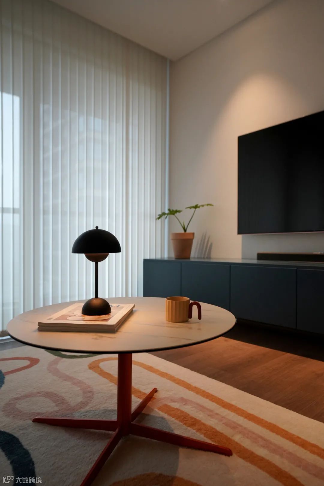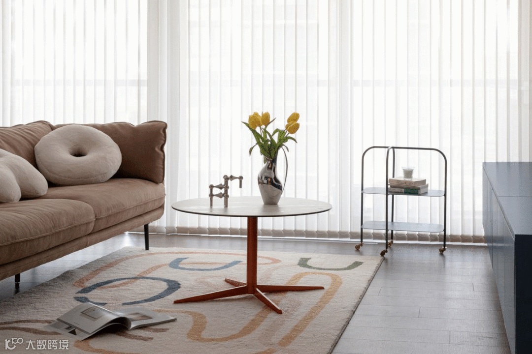 大面积的竖百叶简洁大气,半透的效果既可调节光线,又保护隐私。茶几视觉轻盈、方便移动。