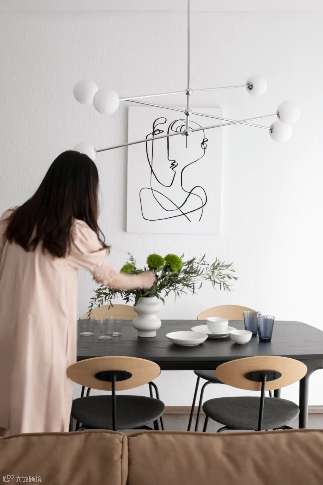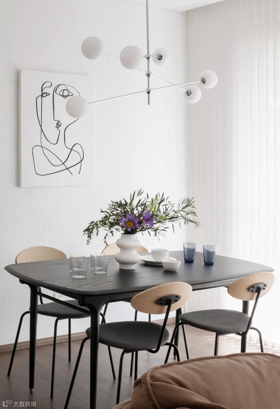 整面落地窗,给室内带来充足的采光,餐厅和客厅以沙发作为界线,隔而不断。