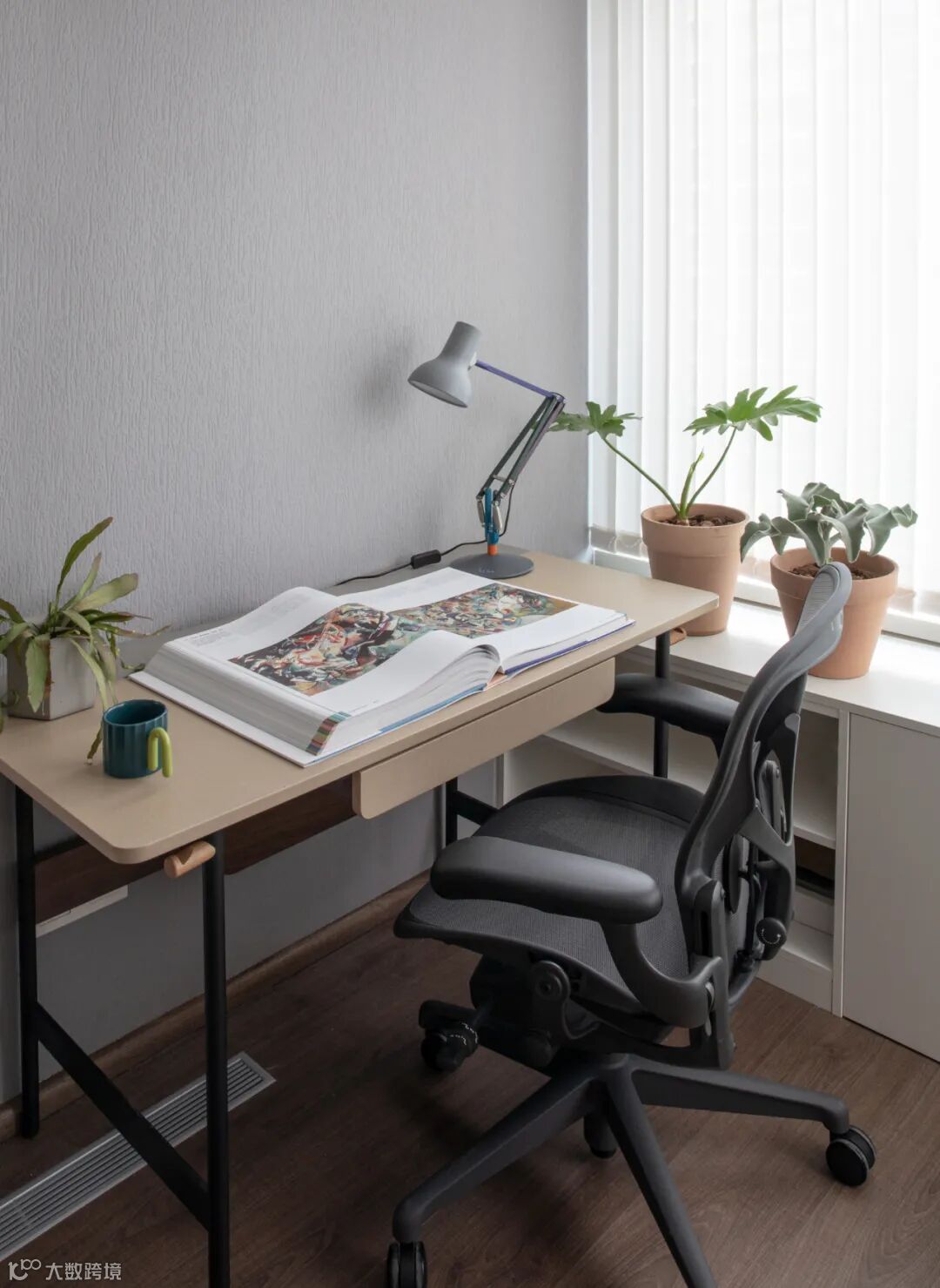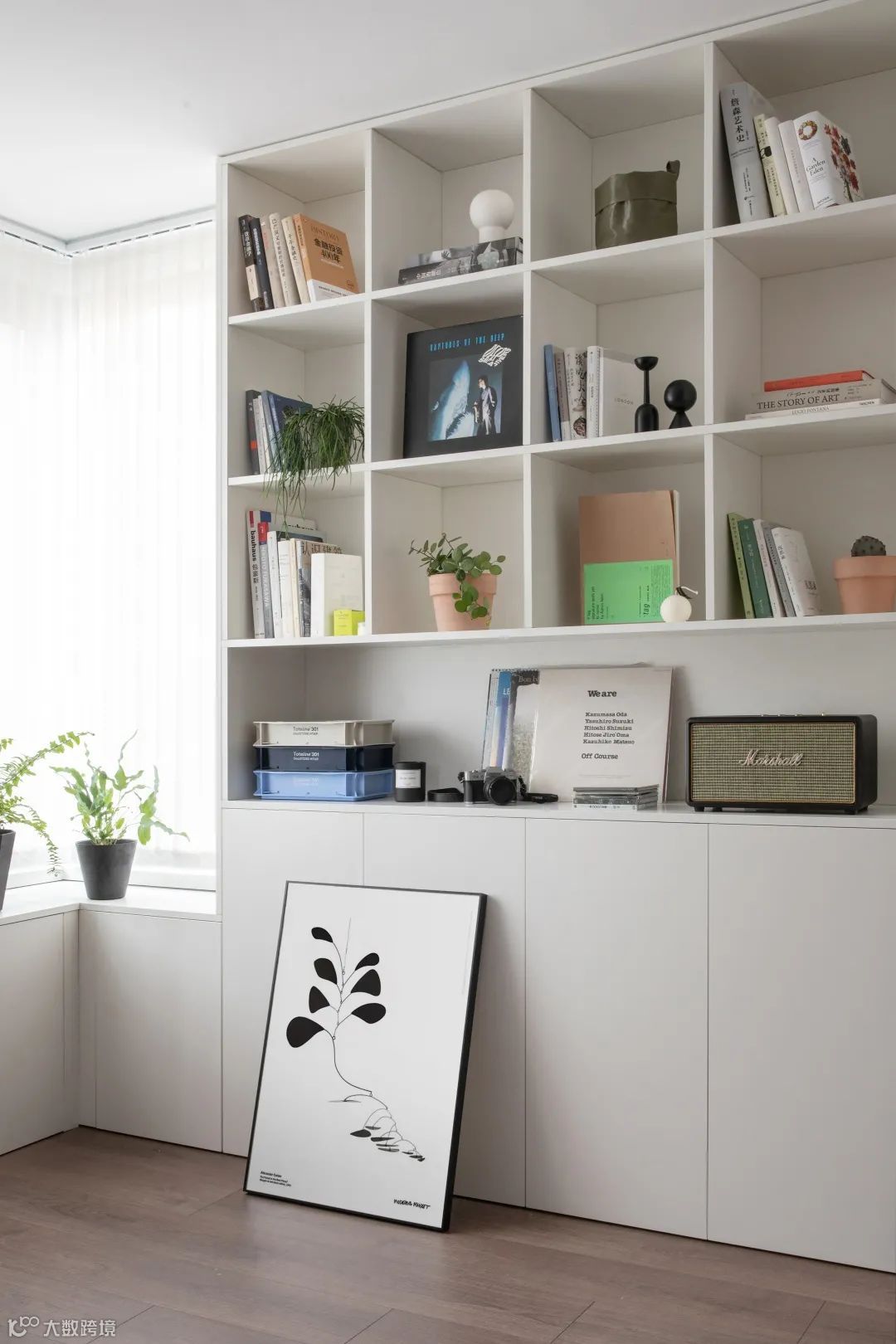 书桌设计贴心实用,隐藏了电源线和插板,卡槽可放置手机和pad等。围绕窗下做了整排的矮柜,用于收纳屋主的电子设备和产品,台面可放置书籍和植物。