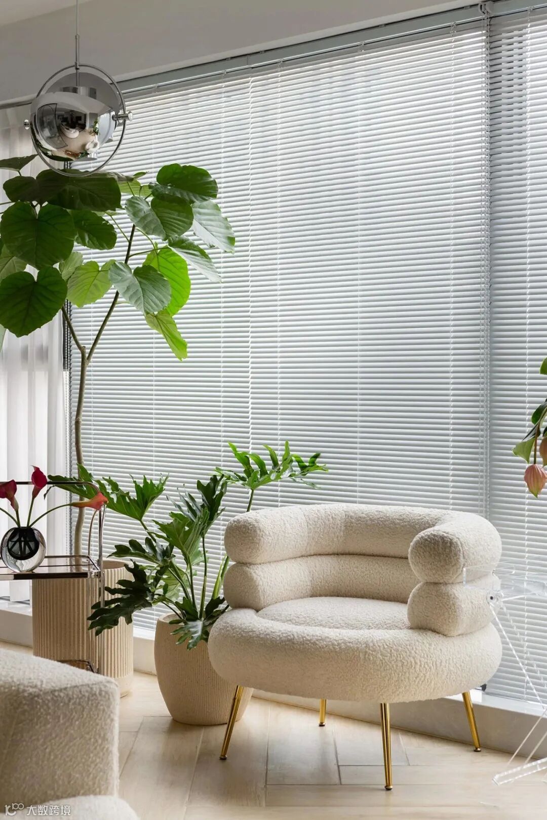 ▲ 在阳台一角,大面积落地窗搭配白色百叶窗帘,不影响室外光照,又能很好地保护室内隐私,绿植+单椅搭配,业主可享受休闲惬意的下午茶时光。