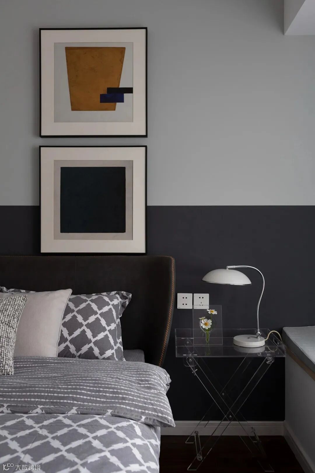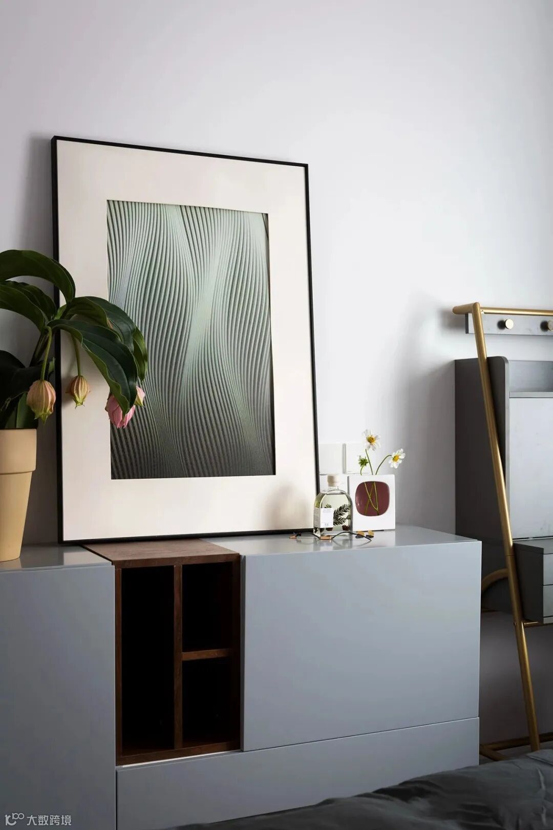 ▲ 深色床头柜选择灰色,个性中带点清冷意境,背景墙并无过多装饰,挂画亦是立于斗柜之上,搭配着小型绿植,有着净化空间的作用。