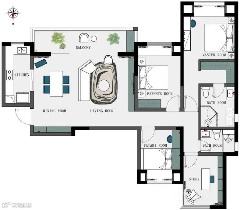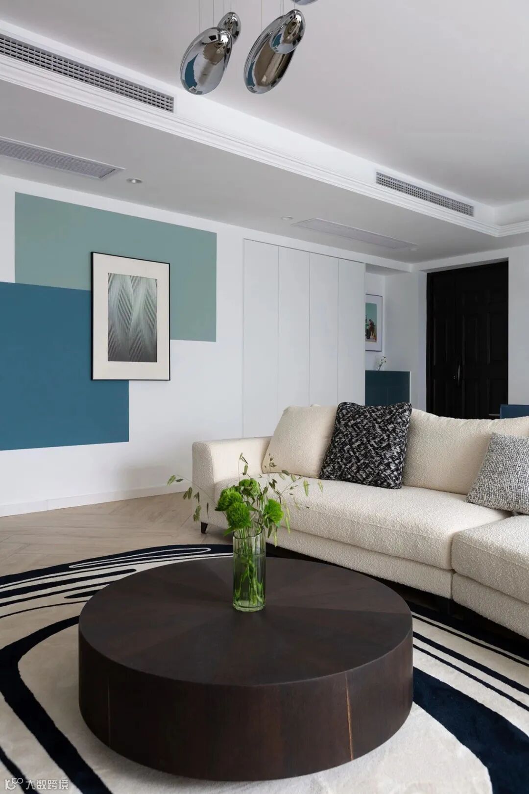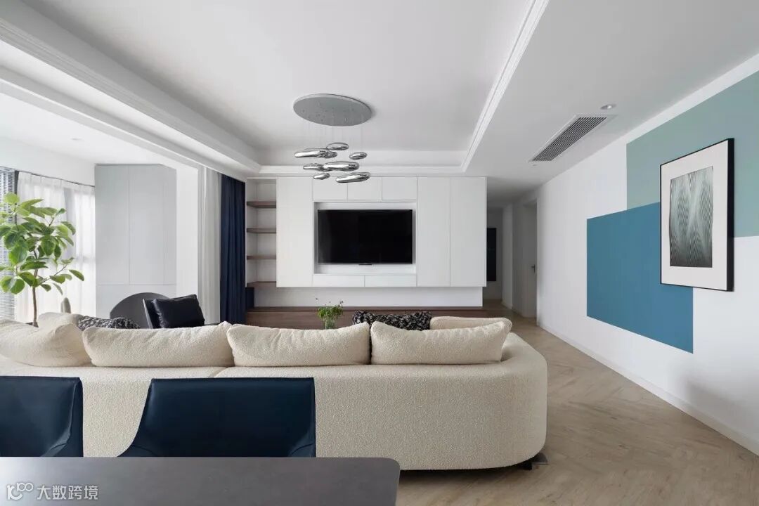 ▲ 客厅与阳台之间打通,空间动线更为便利,过道墙面局部选择蓝绿分色设计,给清冷空间带来颜色点缀,填补大白墙所带来的空白感。