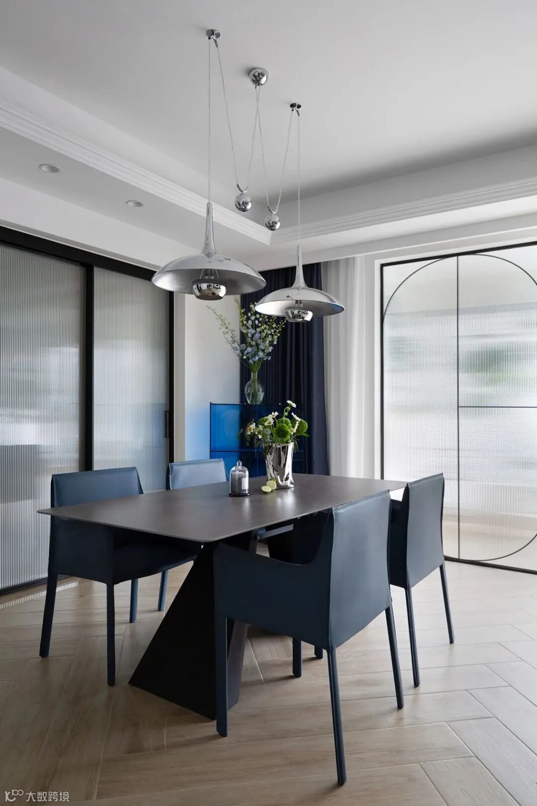 ▲ 餐厅空间:蓝色纳帕皮餐椅搭配黑色餐桌,增添时尚感,银色吊灯与客厅吊灯色彩材质皆一致,质感十足,营造温馨的用餐空间。