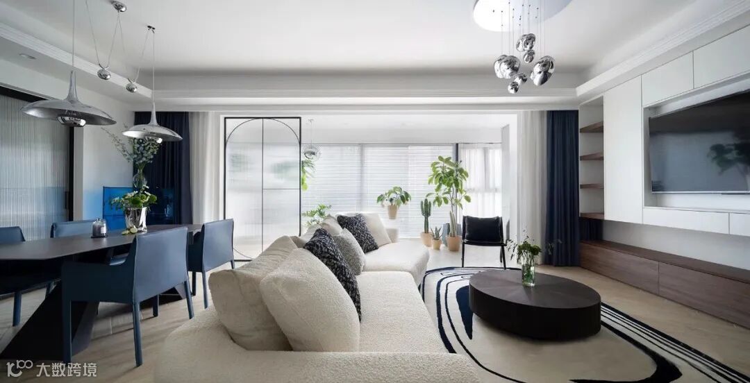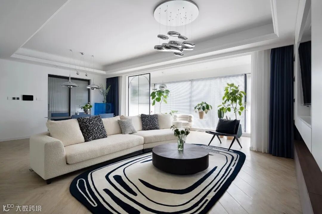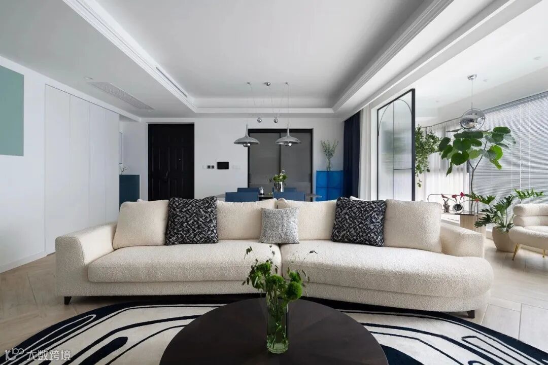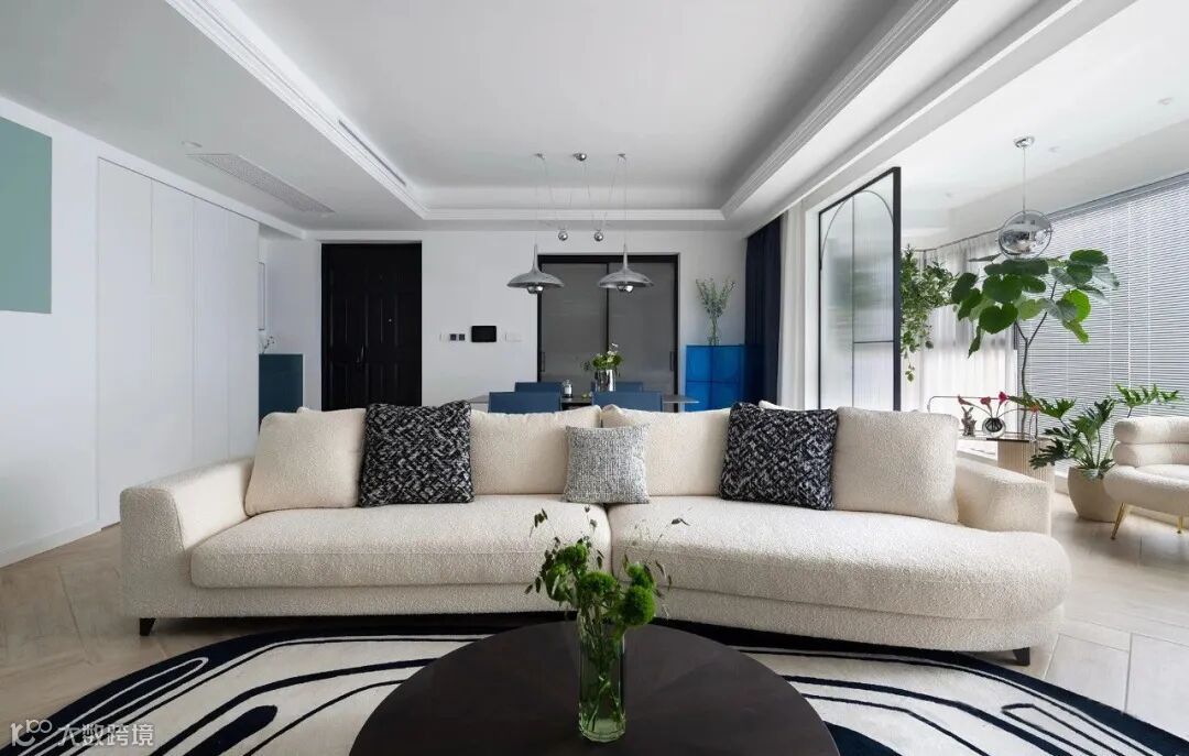 ▲ 客厅空间:米白色主沙发搭配黑白相间的地毯,软糯温馨感更甚,阳光从室外穿透过来,整屋都明媚柔和起来了。