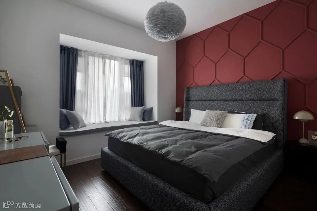 ▲ 主卧空间:业主两人皆对酷酷的事情感兴趣,因而背景墙选择个性张扬的红色,深灰色高背床与浅灰色羽毛灯与空间完美融合。