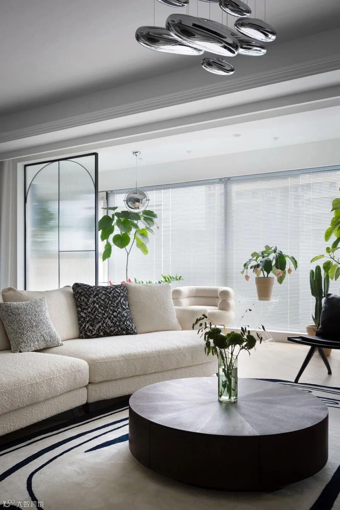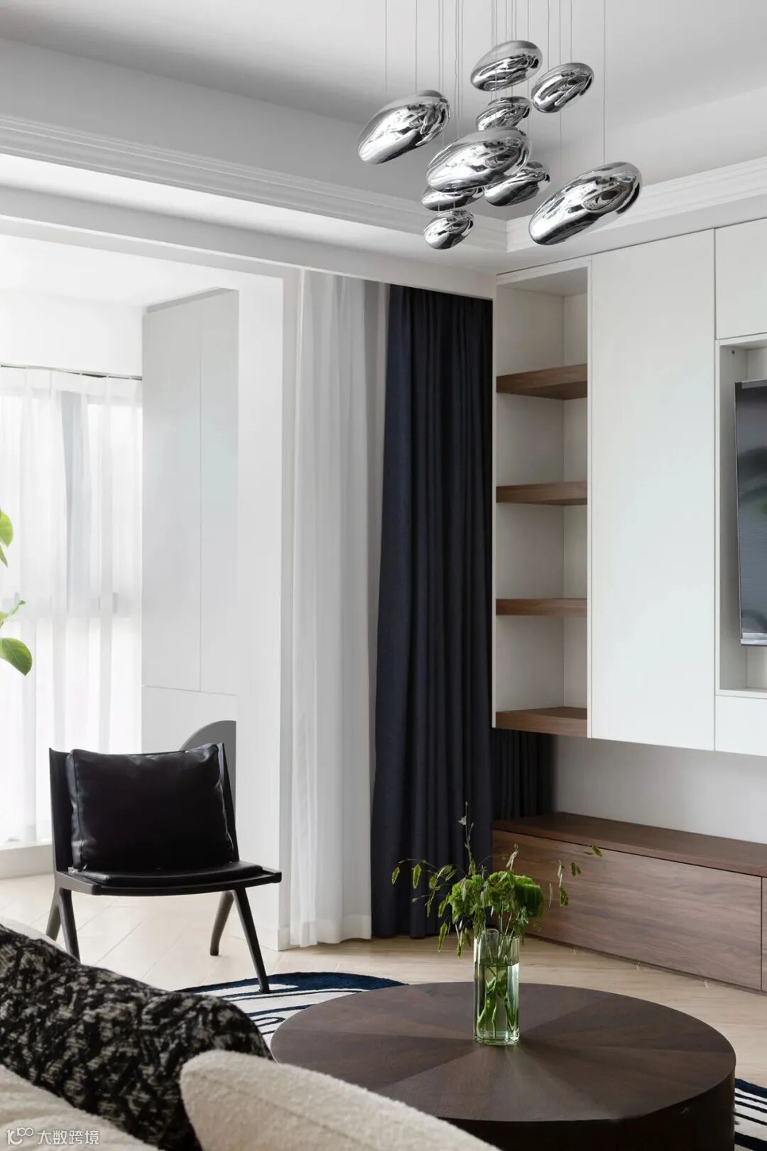 ▲ 黑色圆形茶几,更省空间,木材质厚实易打理,黑白搭配经典耐看不易出错,混搭风格中的高级感,再辅以绿植,地毯这些亮点装饰。