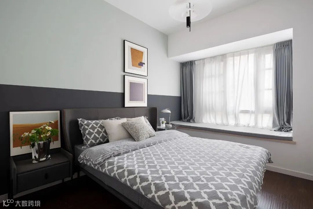 ▲ 次卧空间:浅灰色+深灰色上下分色设计,保留一个大飘窗,增加休闲一隅,温馨舒适。