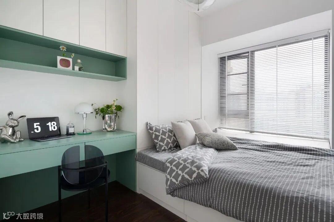 ▲ 多功能房空间:作为备用空间,靠窗榻榻米,满足睡眠和储物功能,绿色书桌清新耐看,与上方跳格相呼应,时尚美观。
