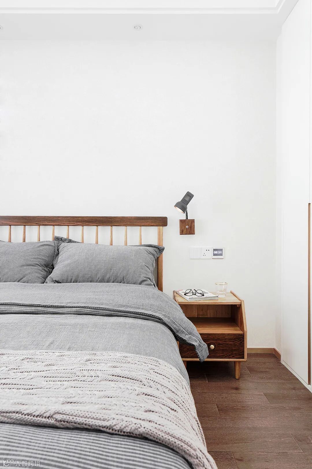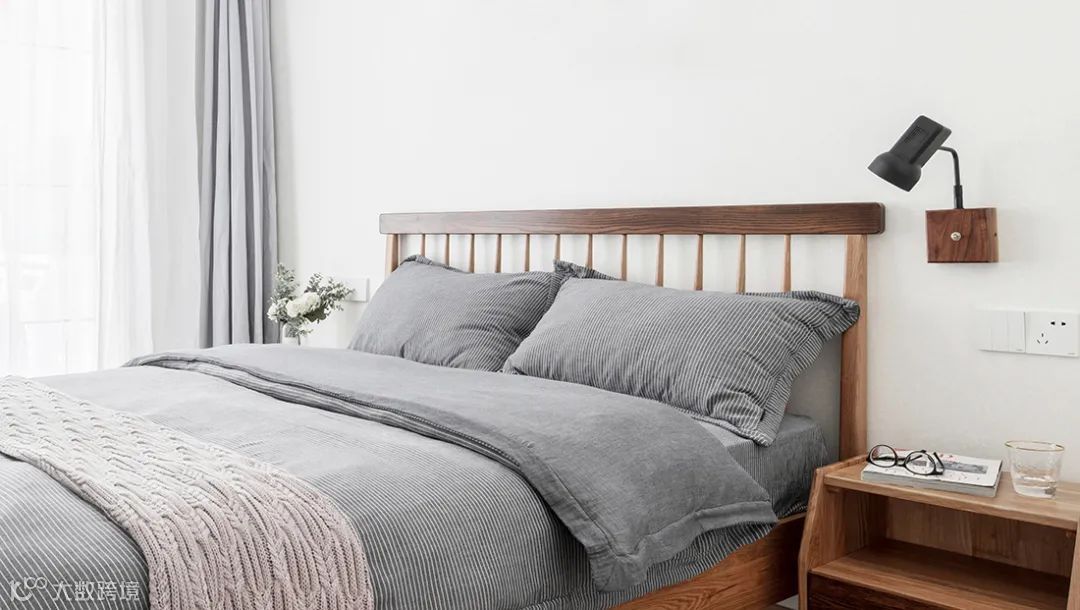 次卧采取实木床铺与床头柜,摆上简约灰色床单,给人简洁而耐用的感觉。