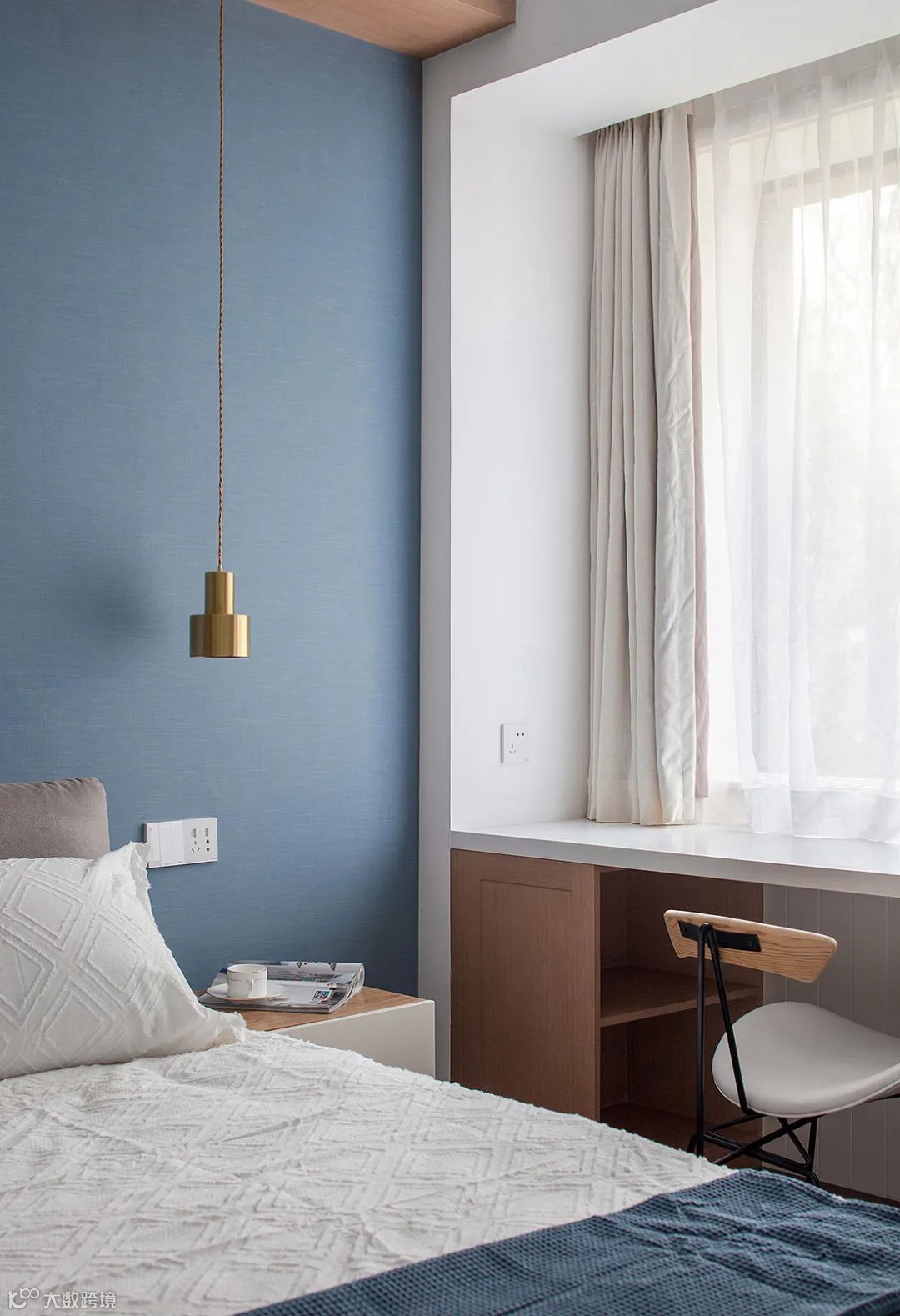 蓝色的床头墙,在靠窗位置定制的书桌,布置素雅的床单与窗帘,整个空间显得轻松舒适而自然。