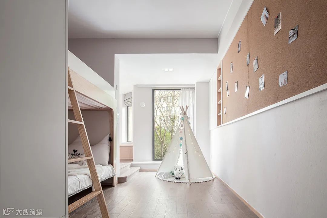 儿童房采取上下床的设计,布置小帐篷,墙面也加入软木板的设计,软木板上挂满小照片,让空间显得童趣舒适而活泼。