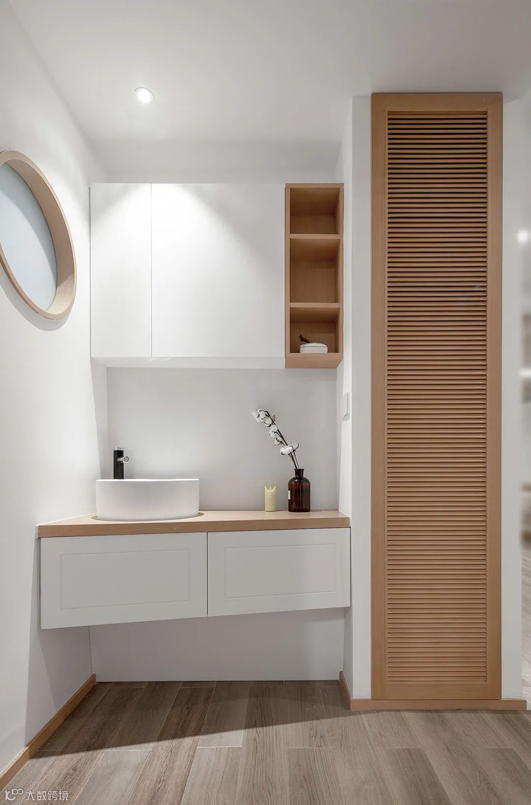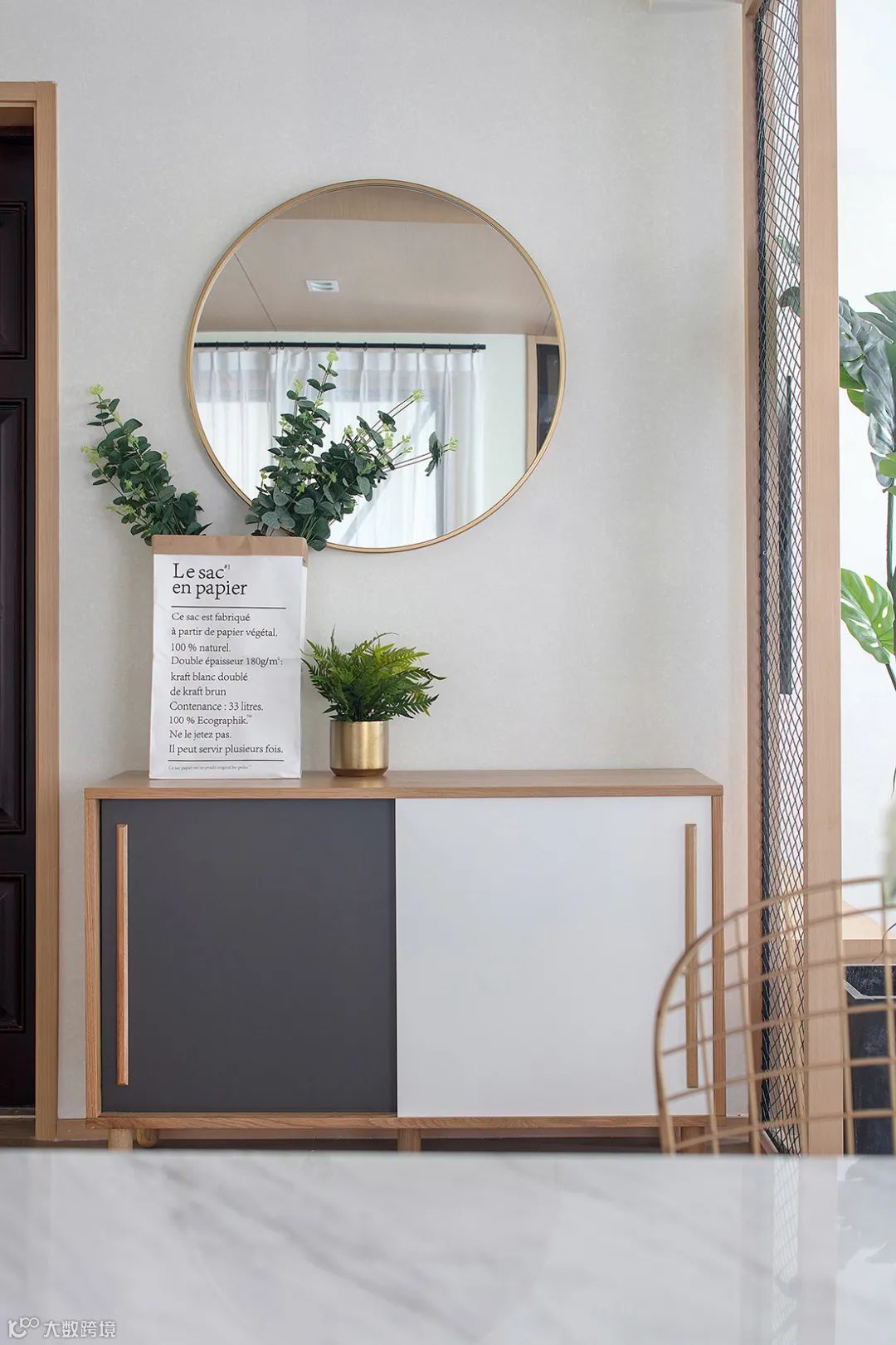 玄关布置原木色矮柜,柜门以灰白配的设计,墙上挂一个圆镜,布置绿植与花瓶摆饰,带来一个清新自然的画面感。