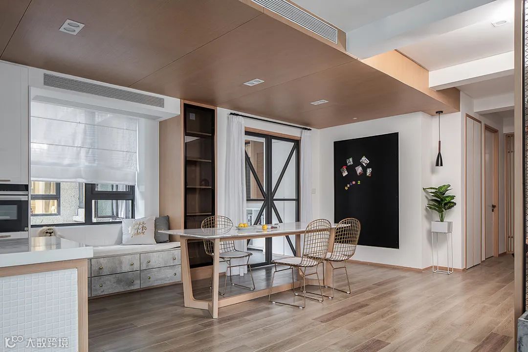原木餐桌在台面加入岩板,而餐桌则是轻奢范金属材质,整体布置显得更加时尚耐用而高级。旁边过道加入黑板墙的设计,也显得更加小资而情趣。