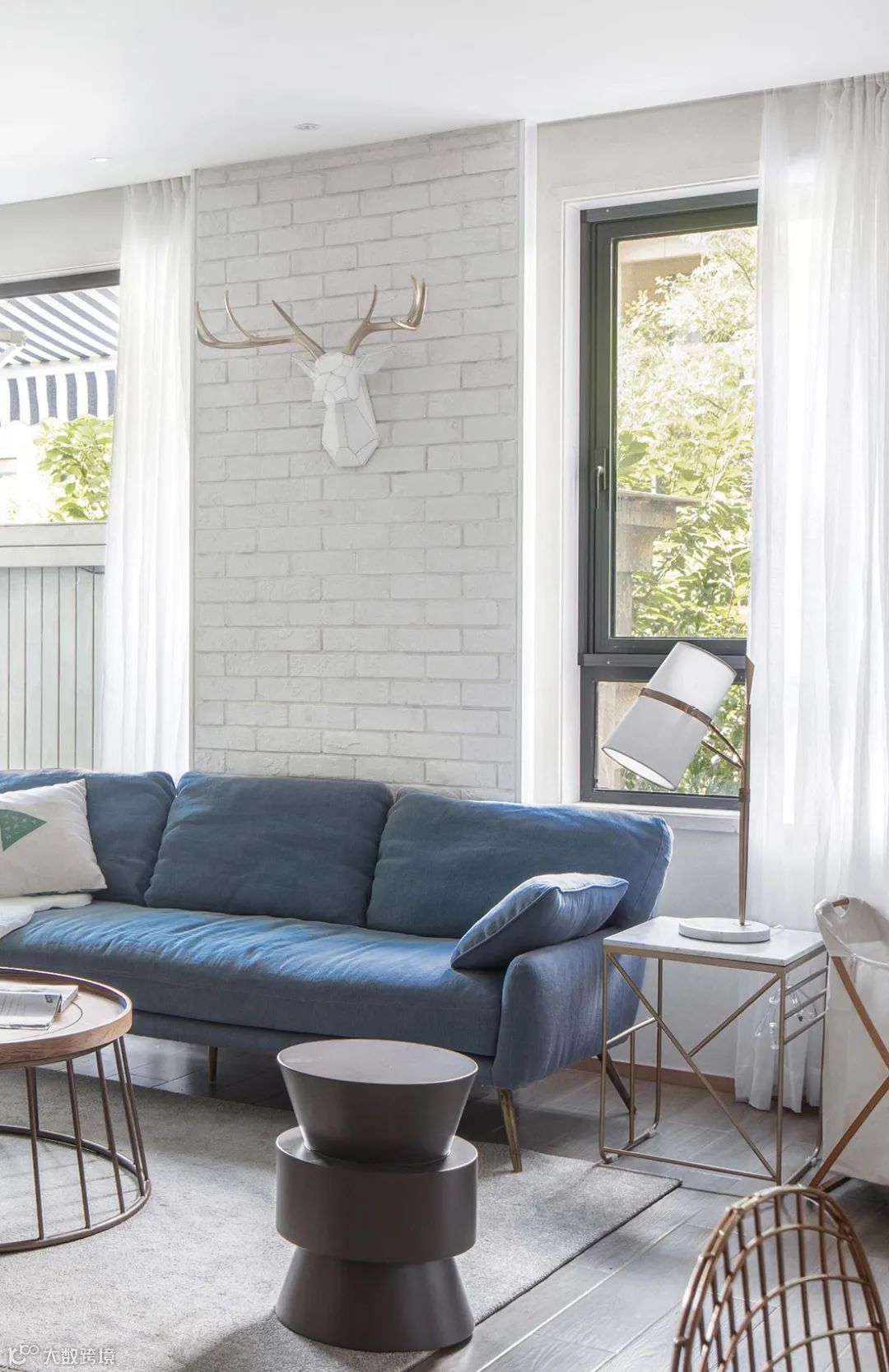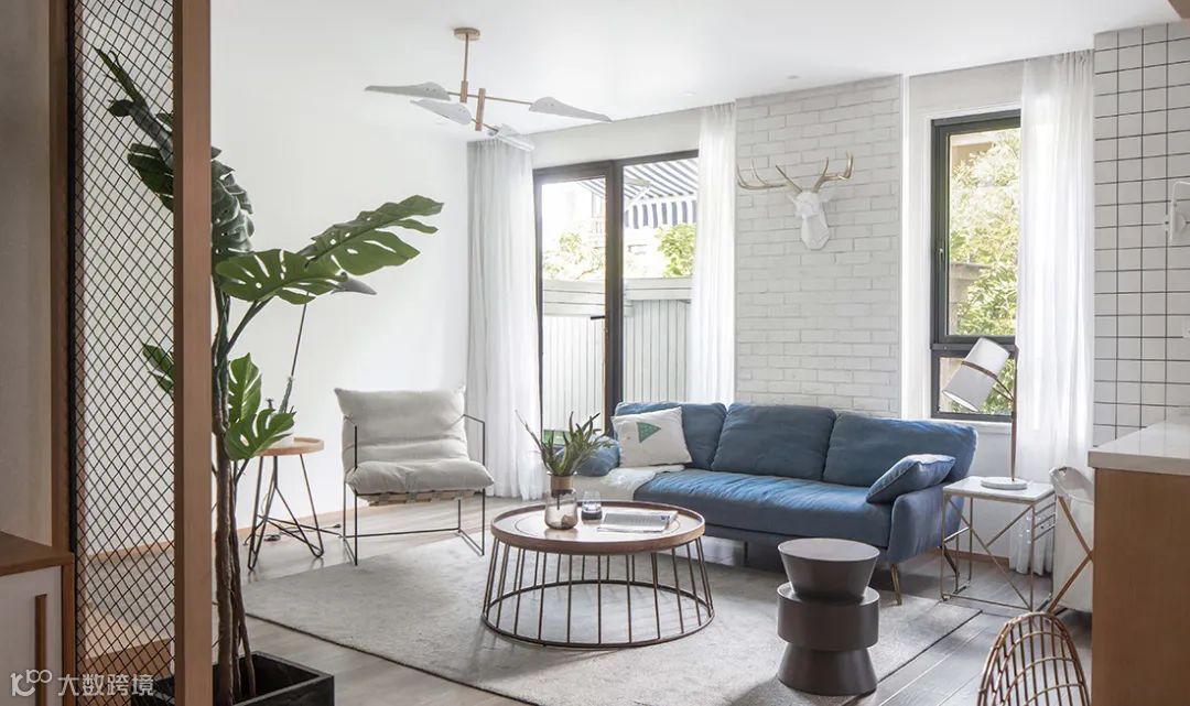 水蓝色的布艺沙发,后方背景墙是白色文化砖的墙面,挂一个鹿头装饰,也让空间显得充满北欧的舒适气息。而沙发两侧则是窗户,这样明亮大胆的布置,也彰显出主人年轻不拘一格的生活态度。