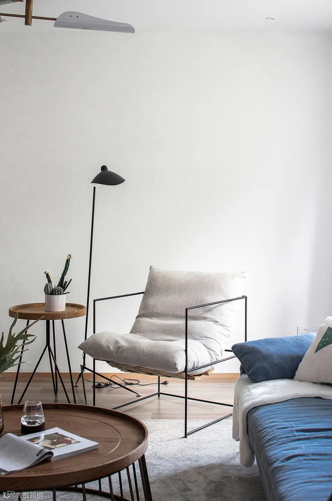 床头左侧摆个木色床头柜,上方极简的金属制吊灯,也让卧室显得更加舒适自然而惬意。