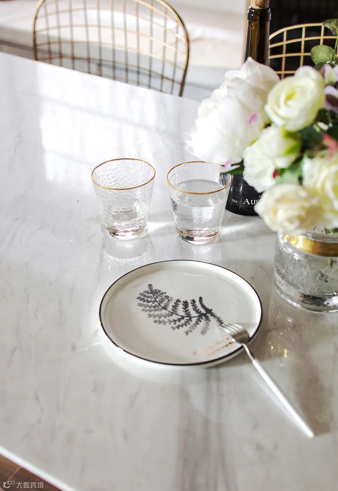 餐桌上的餐具与玻璃杯、花瓶,也让用餐氛围更加端庄。