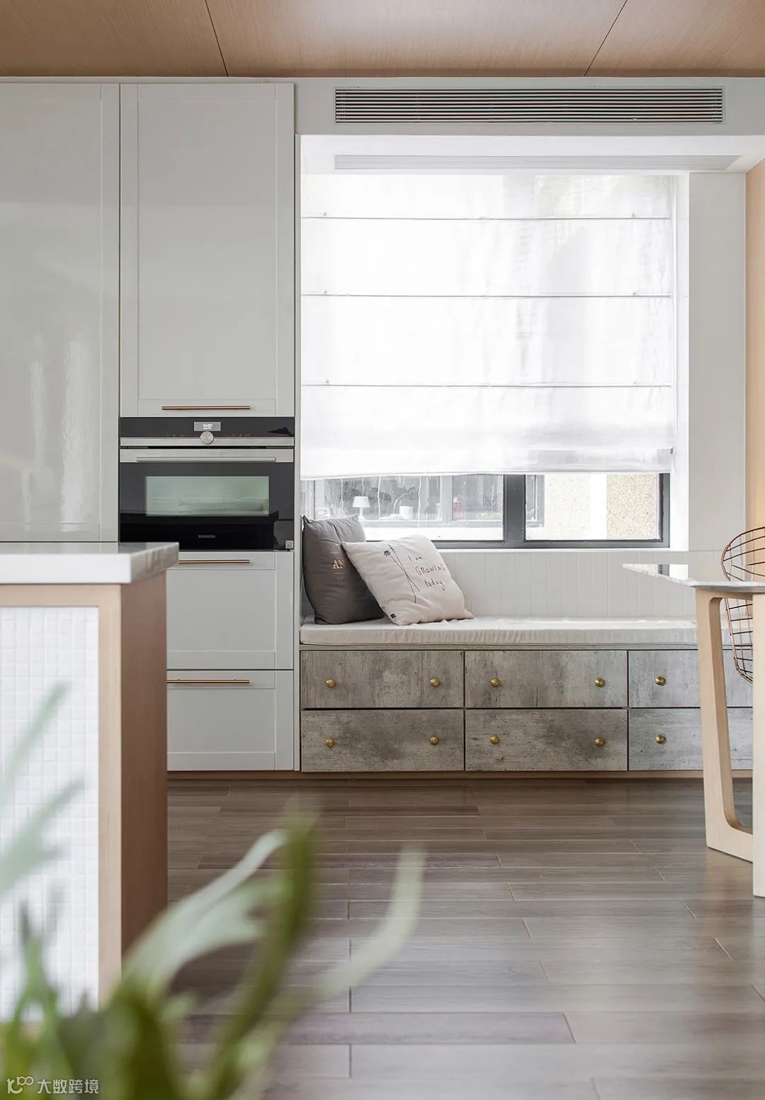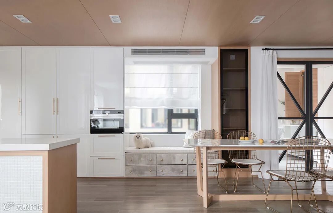 餐厅与厨房之间的窗户,加入一个飘窗柜,不影响采光,又让生活空间更加情趣舒适。