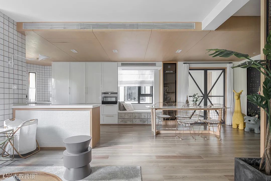 餐厅厨房采取的是开放式的空间设计,布置餐桌与中岛台,天花木色的吊顶+无主灯设计,显得显得充满文艺与精致的气息。