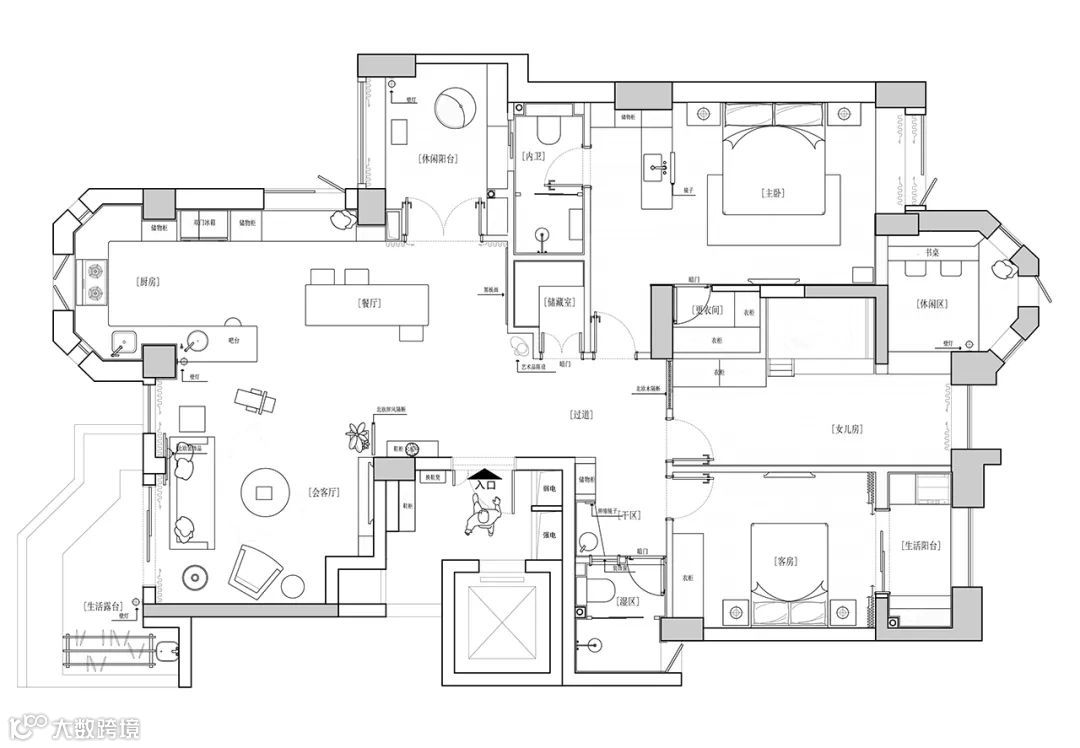 在客厅与厨房之间,加入中岛台,这样可以挡住厨房的杂乱,保持客厅区域的美观。