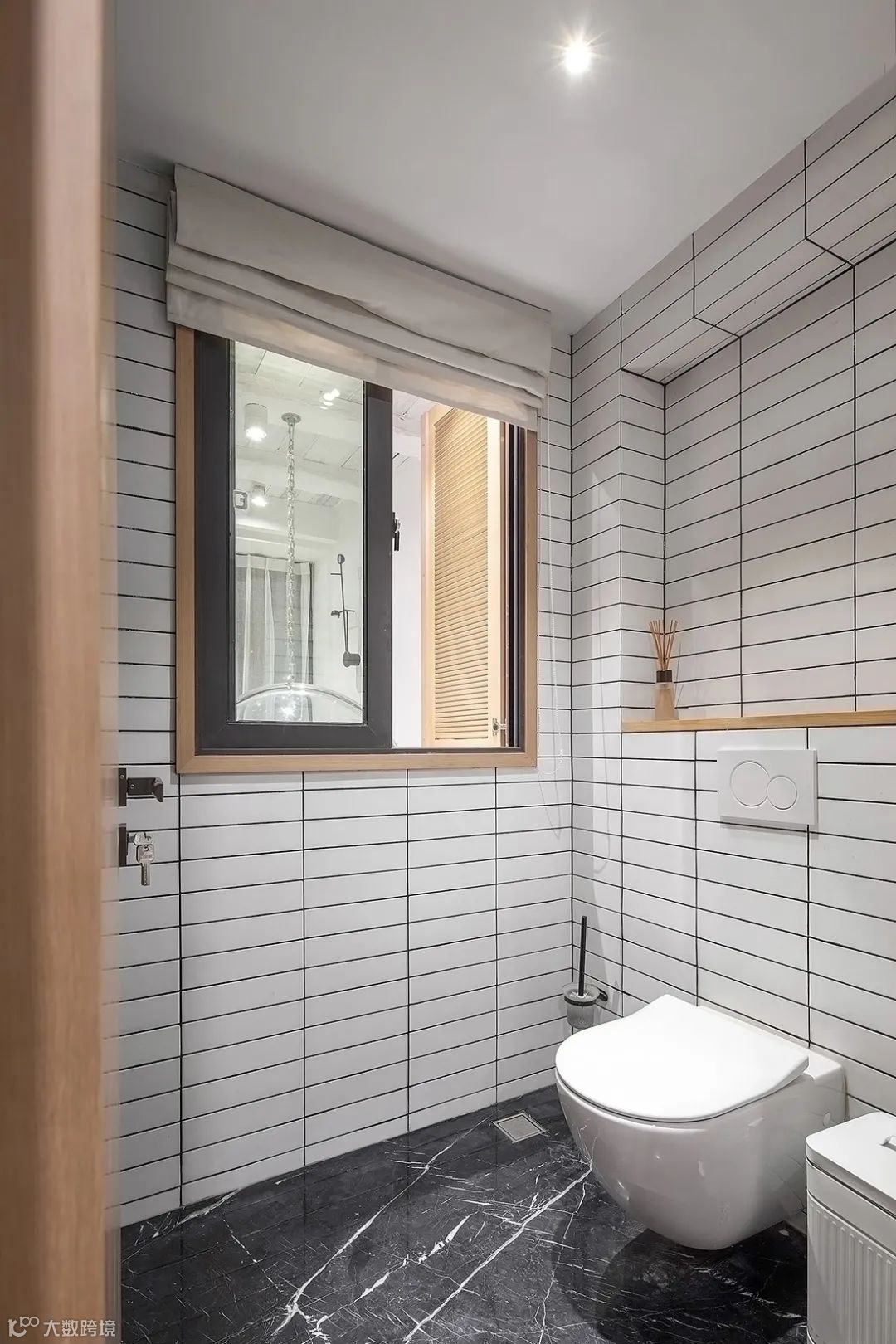 卫生间以仿大理石的深灰色地砖,结合长条小白砖墙面,壁挂马桶后方的小台面以木质垫上,整体空间也是干净优雅而文艺大气。