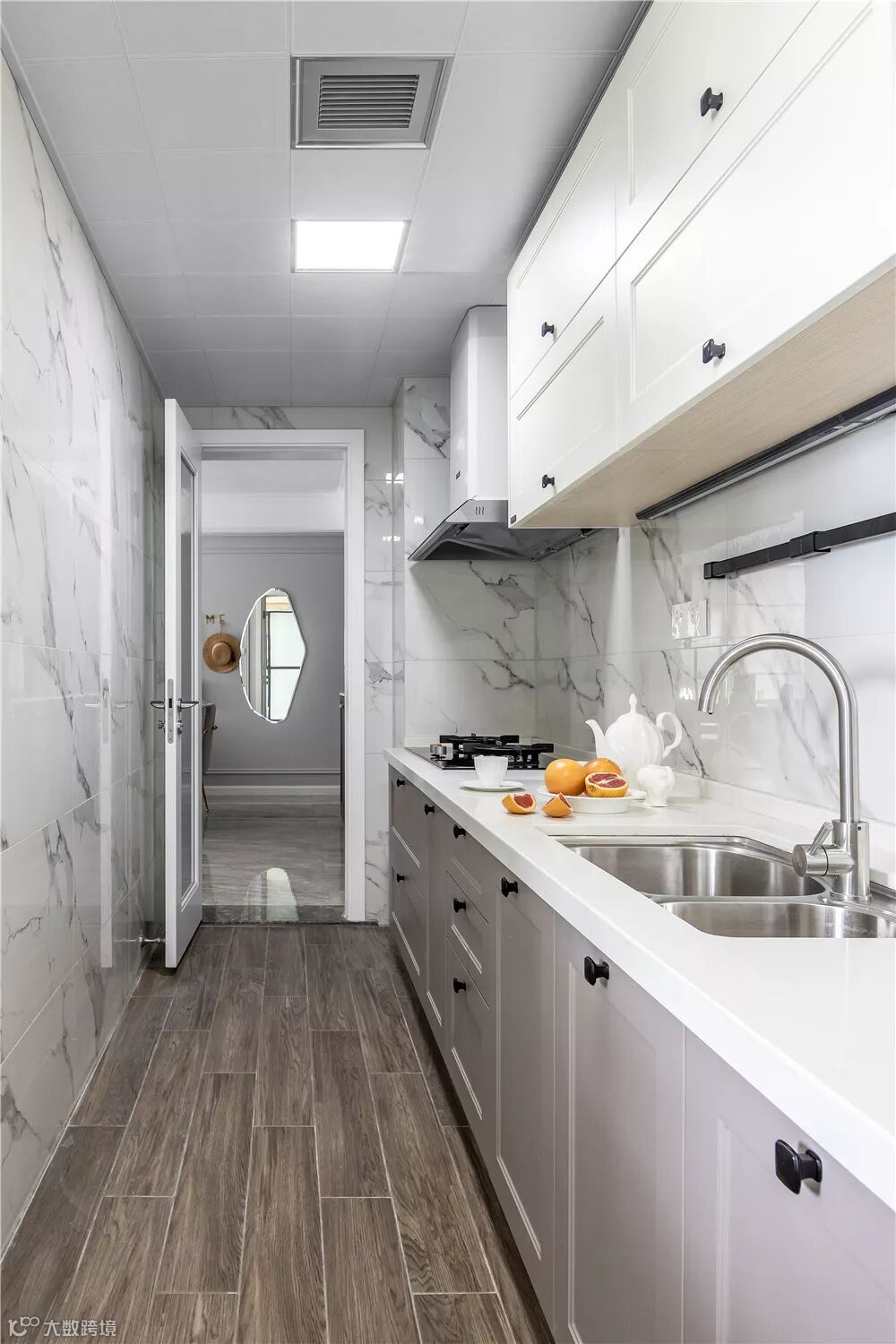▲厨房在木纹砖地面基础,墙面贴着雅白的仿大理石砖,宽敞的操作台面,也为主人的烹饪提供了舒适方便的体验。