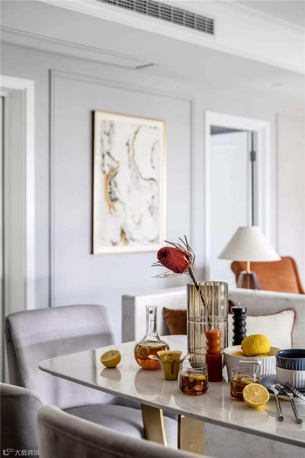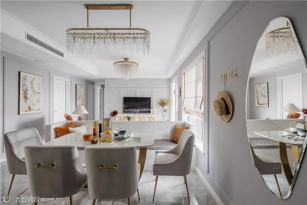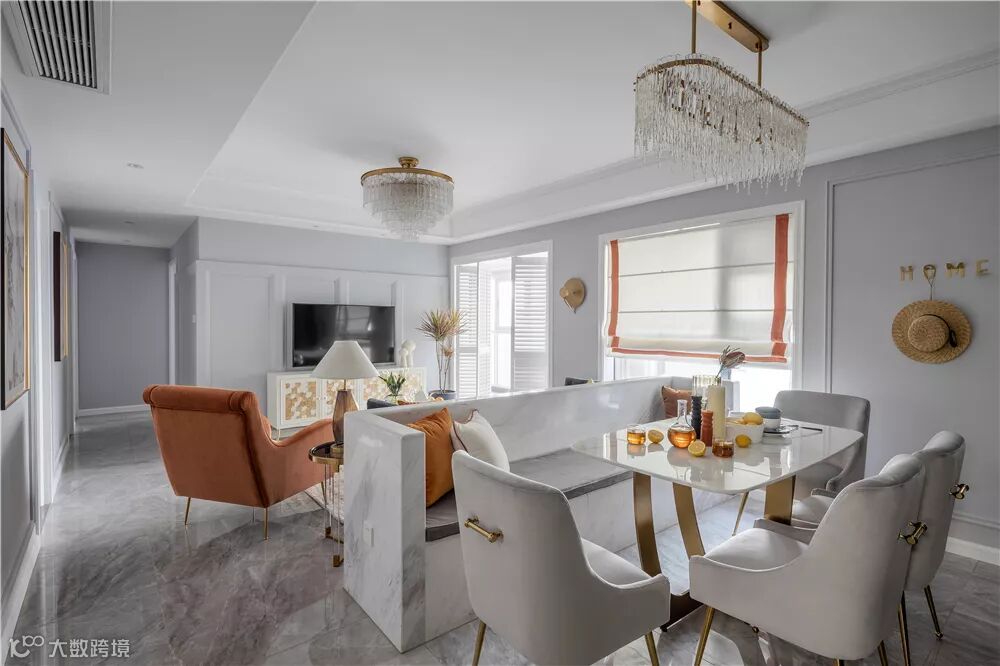 ▲餐厅客厅是横厅格局,沙发与餐桌之间,做了一个大理石包边的卡座,结合大理石轻奢风的餐桌,搭配几张现代优雅的餐椅,让空间显得时尚优雅而气质。