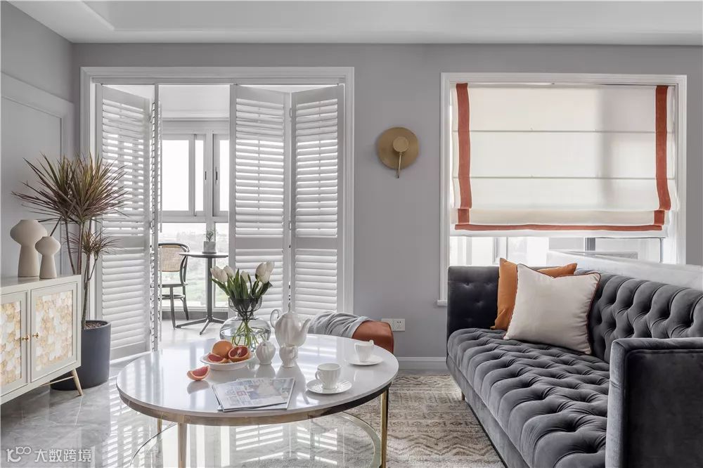 ▲复古灰色的沙发,两旁是橙色单人沙发椅与板凳,沙发上也摆了橙色的抱枕,让空间透露出一个安静的热情