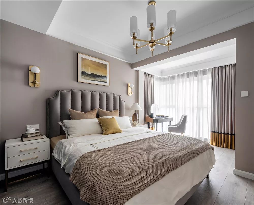 ▲现代简洁的卧室融入了暖心的咖色与安静的蓝色,结合铜色轻奢的细节,呈现出一个稳重大气的优雅画面。