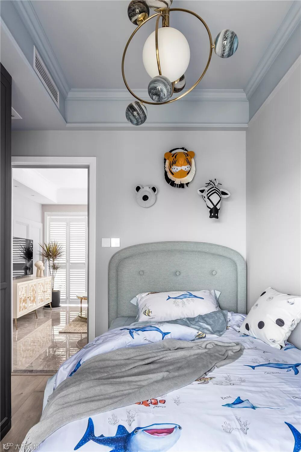 ▲儿童房床头墙挂了三个动物头饰,布艺靠背床也让空间更加舒适安全。顶上的太空主题吊灯,再布置上海洋主题的床单,让空间充满了童趣的活泼感。