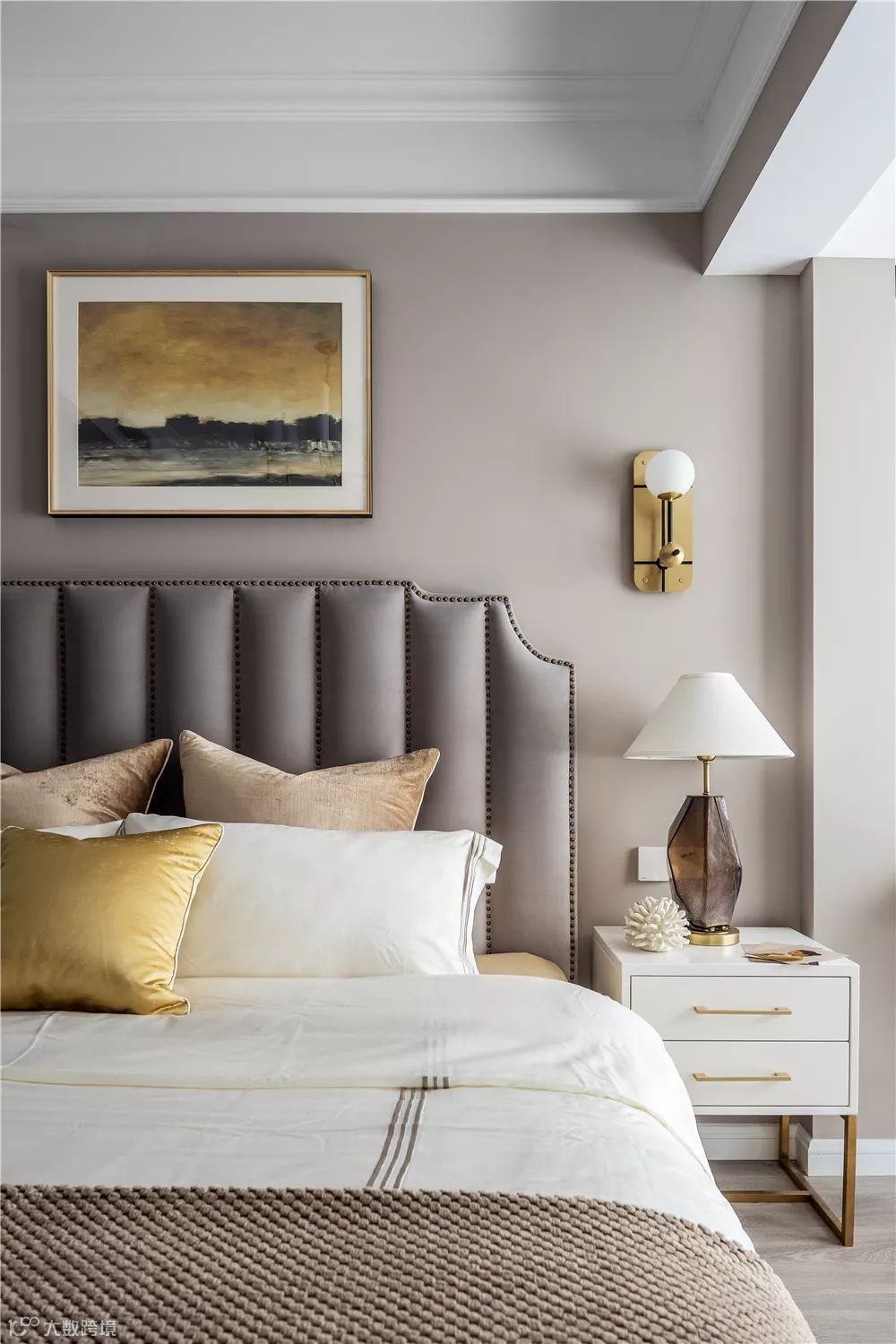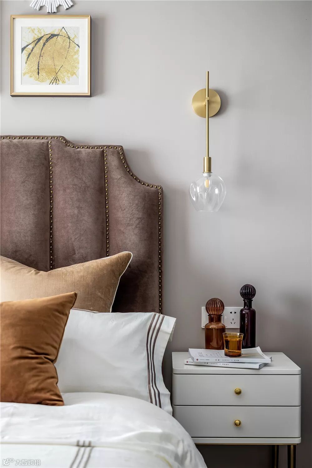 ▲床头柜在铜色框架金属点缀下,摆上一盏独特台灯,显得艺术感满满。