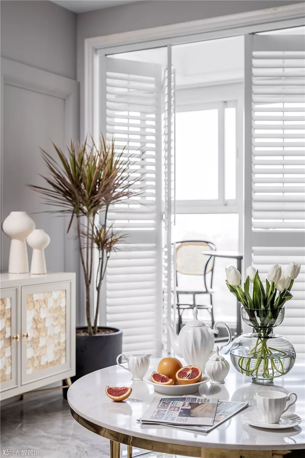 ▲典雅端庄的贝壳纹理电视柜,旁边一盆千年木盆栽,整个空间都显得华丽档次而自然。