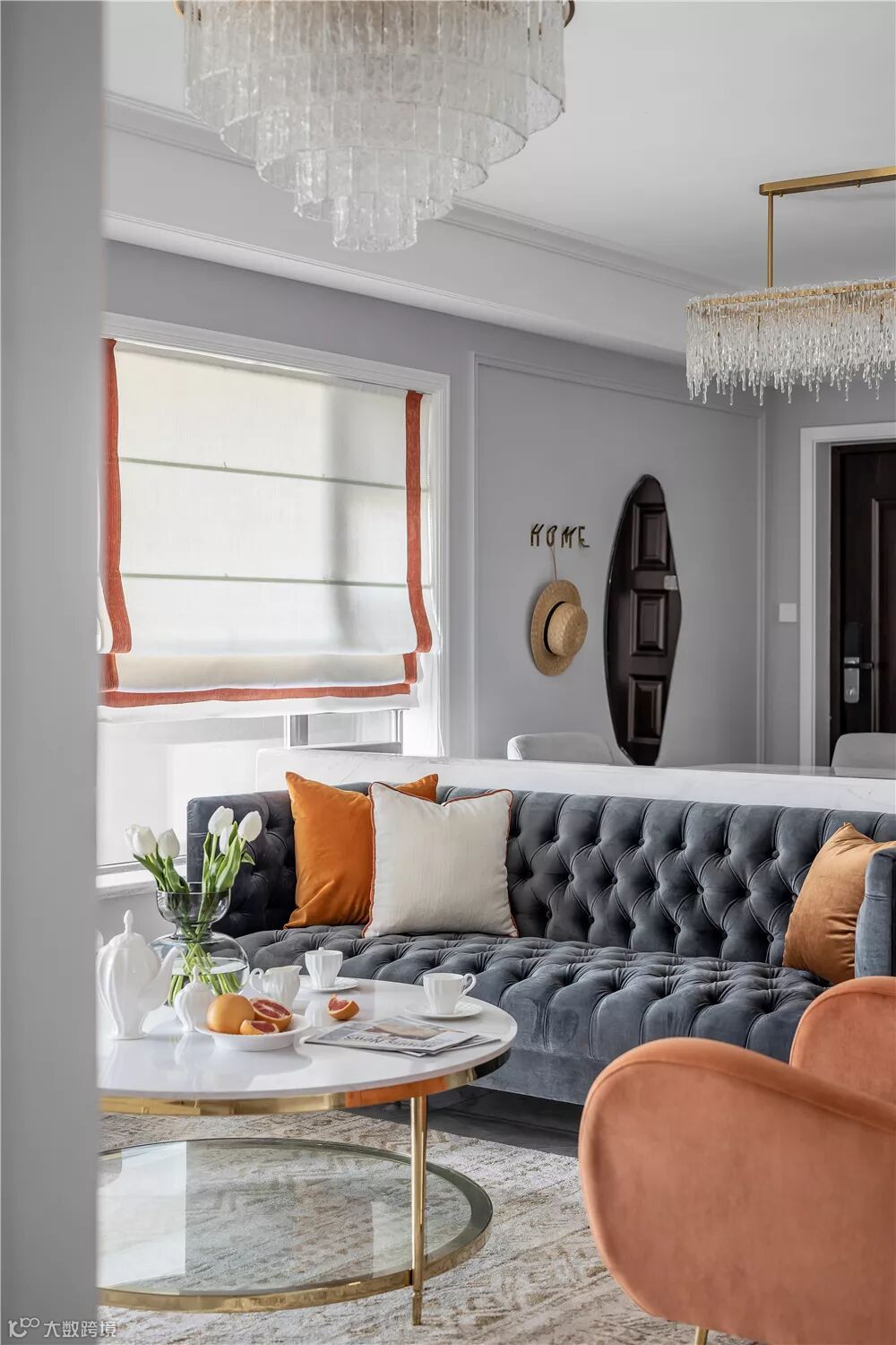 ▲客厅空间现代优雅的硬装,搭配上华丽温情的暖色,加入橙色的细节点缀,让空间透露出一种华丽精致的气质感。