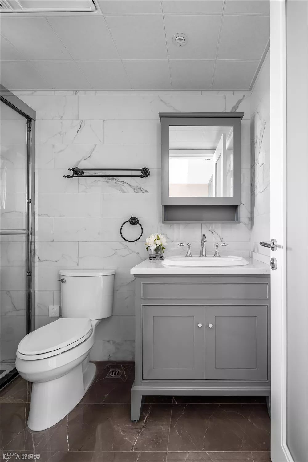 ▲深咖色地面砖+雅白的墙面砖,搭配灰色洗手盆柜,让卧室稳重优雅而舒适。