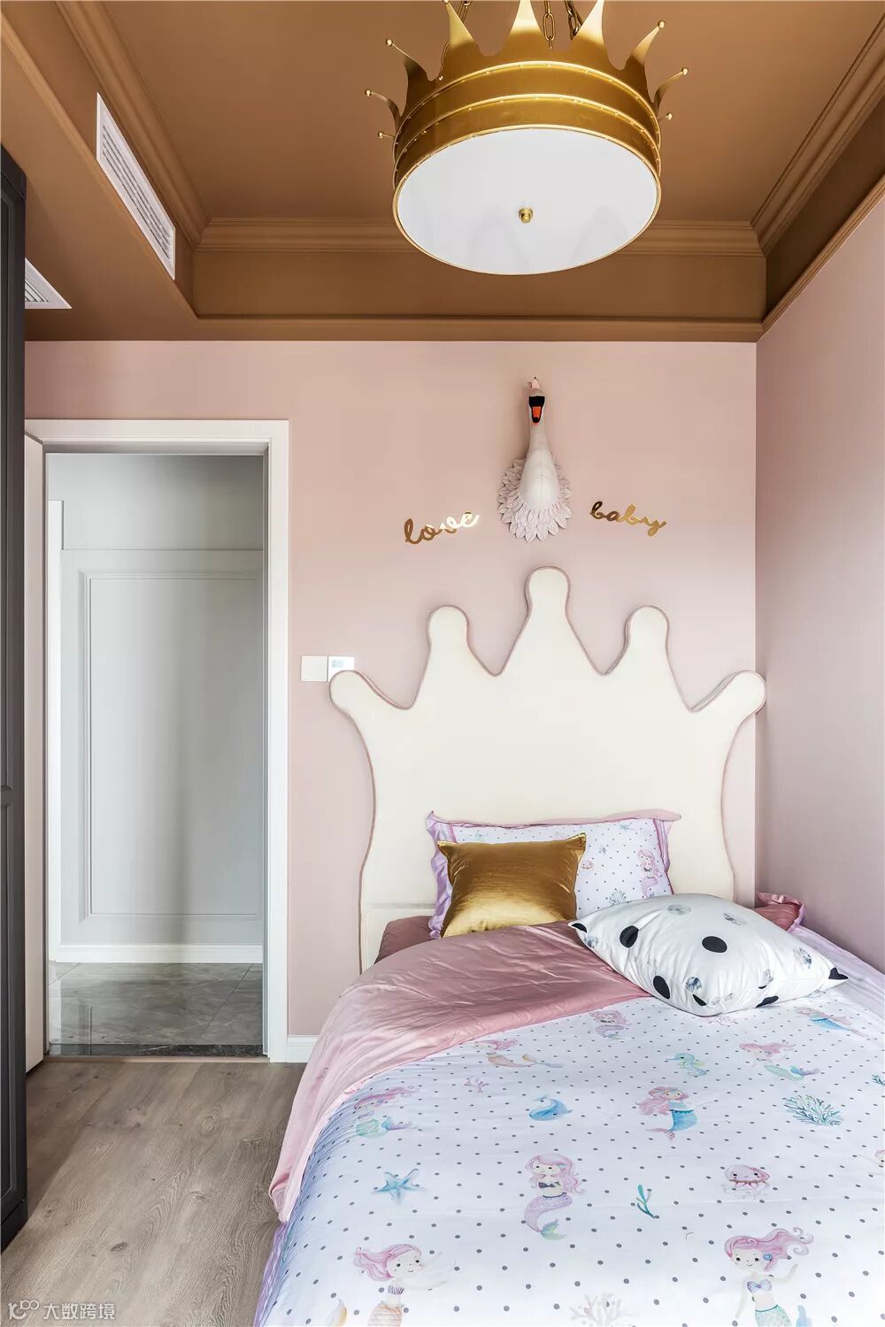▲而女孩房的床铺这个一个皇冠靠背,结合海洋公主范的床单,床头墙的天鹅墙饰,让空间充满了少女心的气质感。