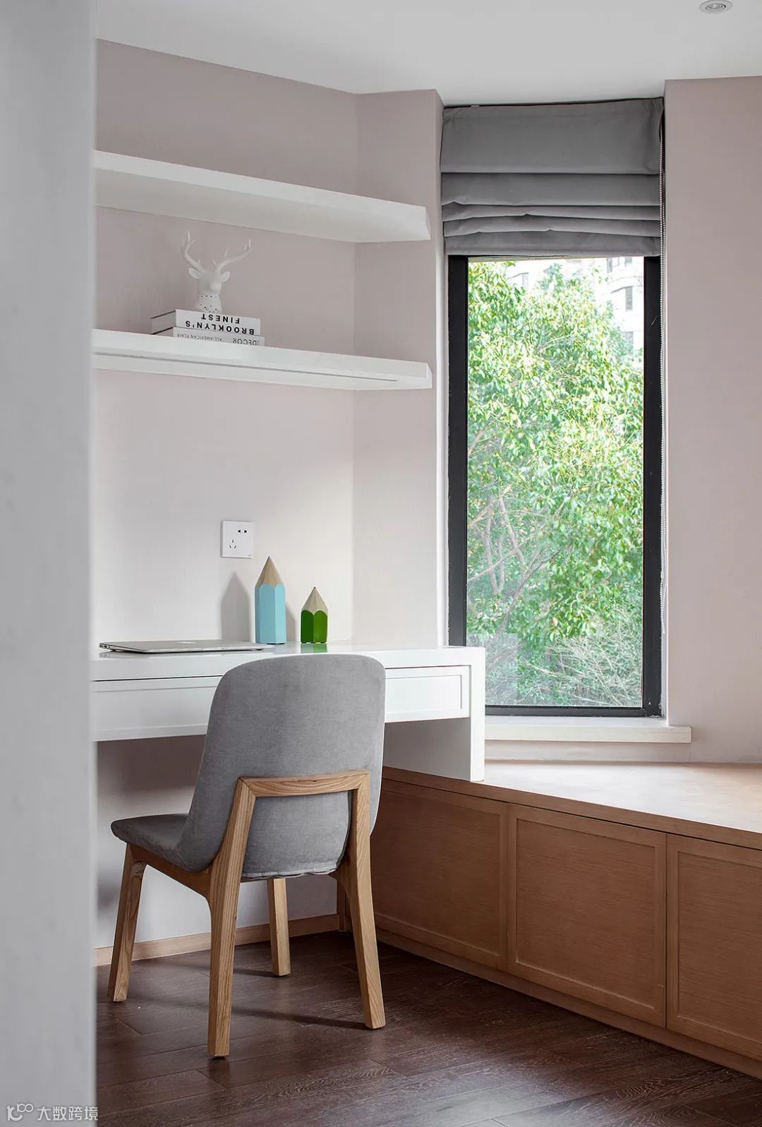 多边形的小角落空间,也是布置飘窗柜与书桌椅,成为孩子学习写作业的私密小区域。