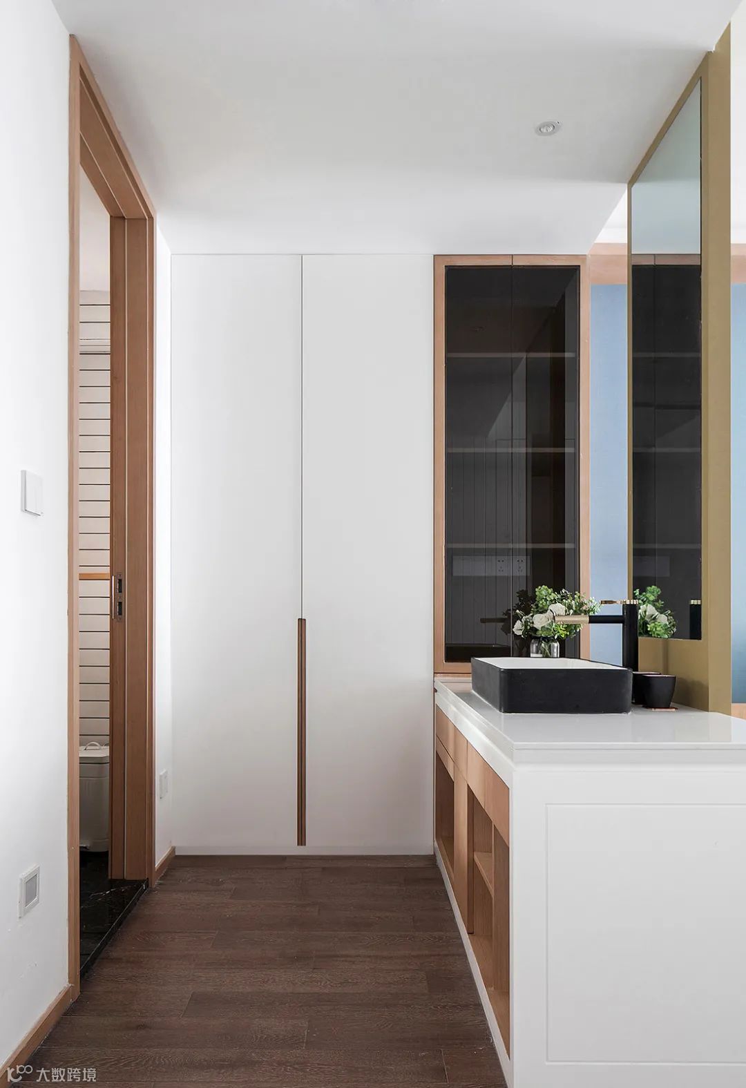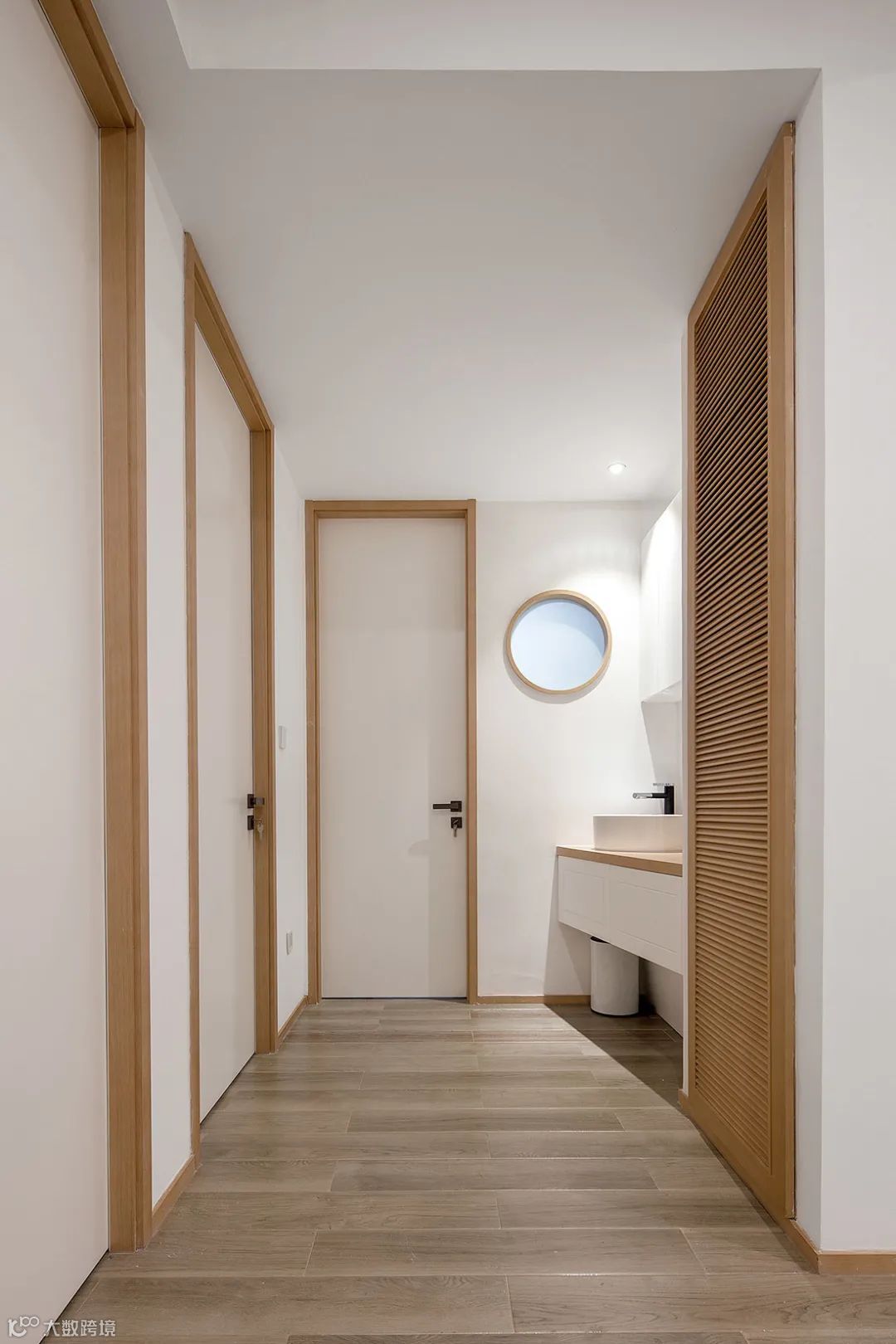 简洁朴素的过道,木色门框与洗手盆等元素,让空间充满轻松优雅的简约感。而过道右边则是加入了洗手盆+杂物间的设计,让空间更加实用。
