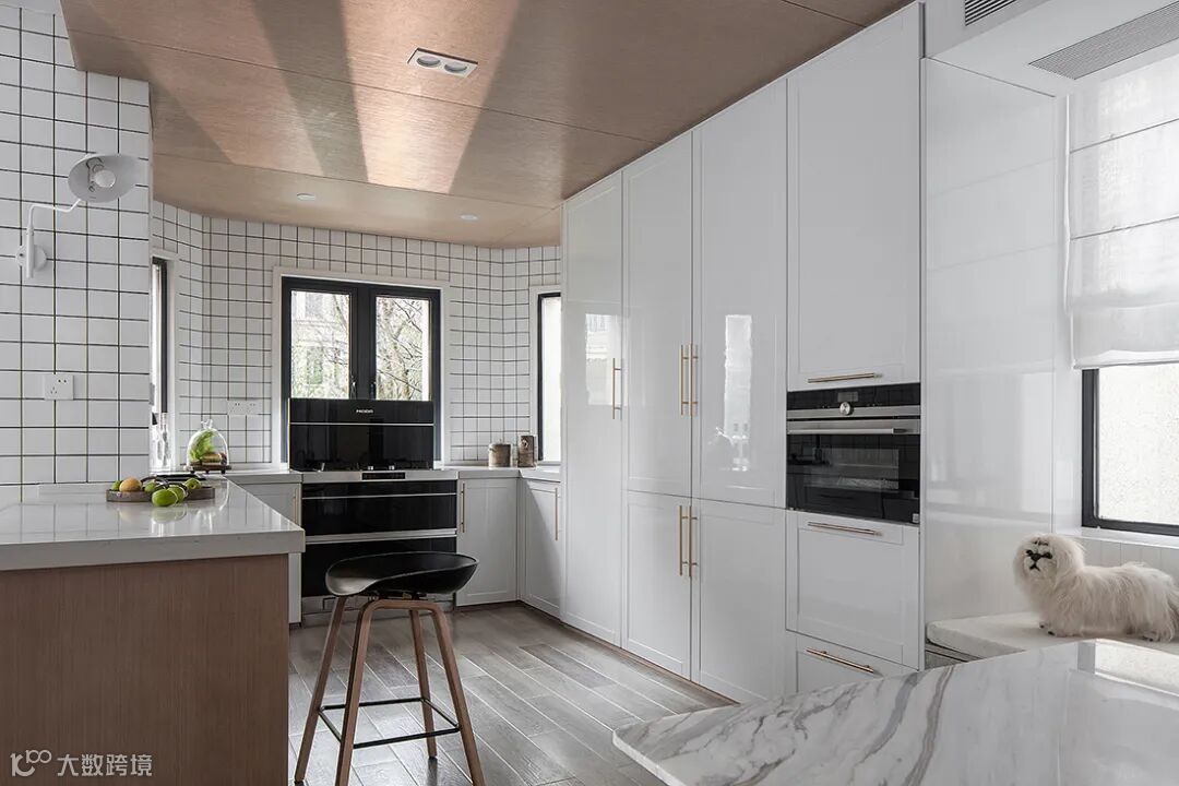 厨房定制大体积的收纳柜,以白色小白砖的墙面,装上集成灶,让空间充满文艺轻松的实用体验。