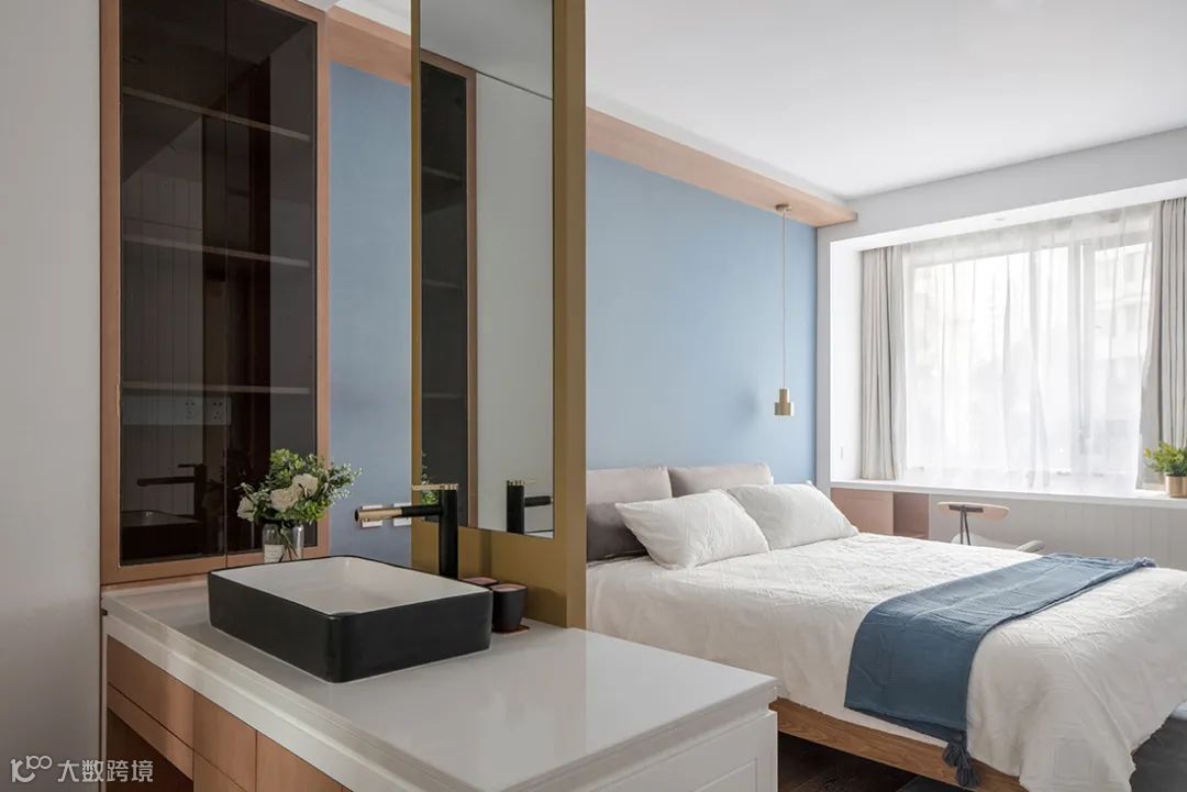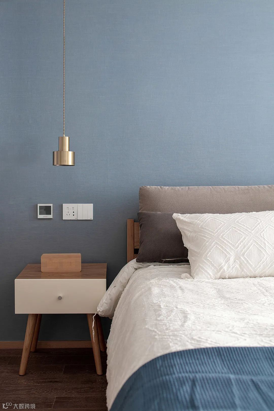蓝色的床头墙,在靠窗位置定制的书桌,布置素雅的床单与窗帘,整个空间显得轻松舒适而自然。