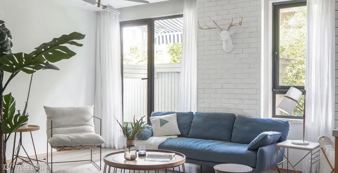 水蓝色的布艺沙发,后方背景墙是白色文化砖的墙面,挂一个鹿头装饰,也让空间显得充满北欧的舒适气息。而沙发两侧则是窗户,这样明亮大胆的布置,也彰显出主人年轻不拘一格的生活态度。